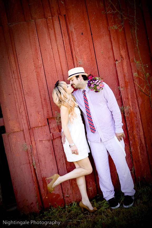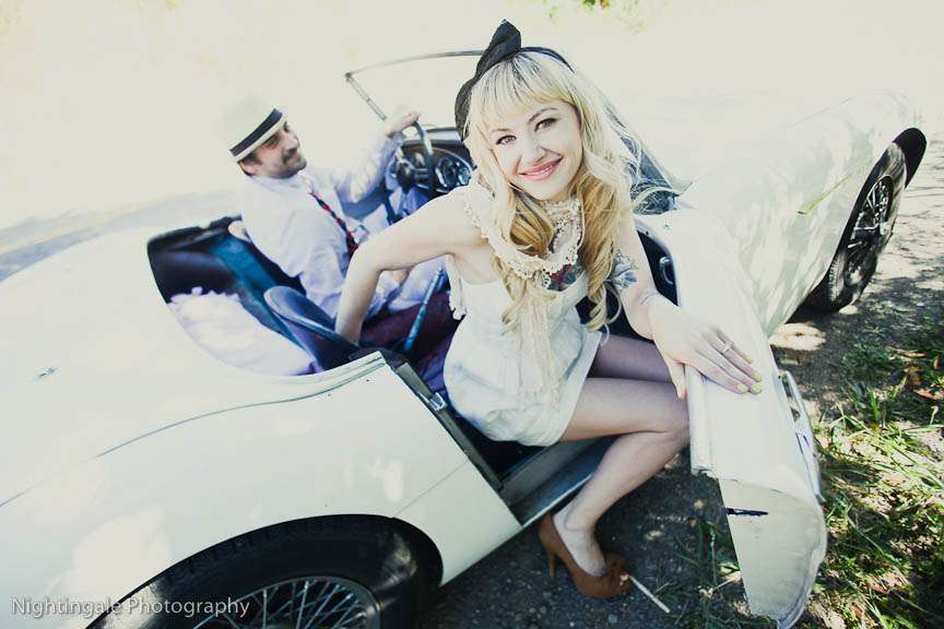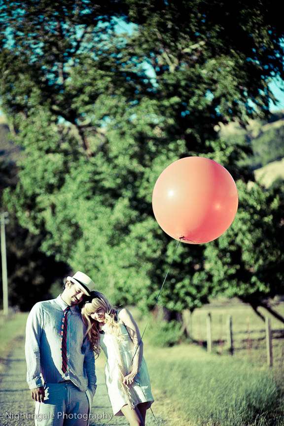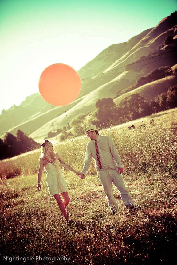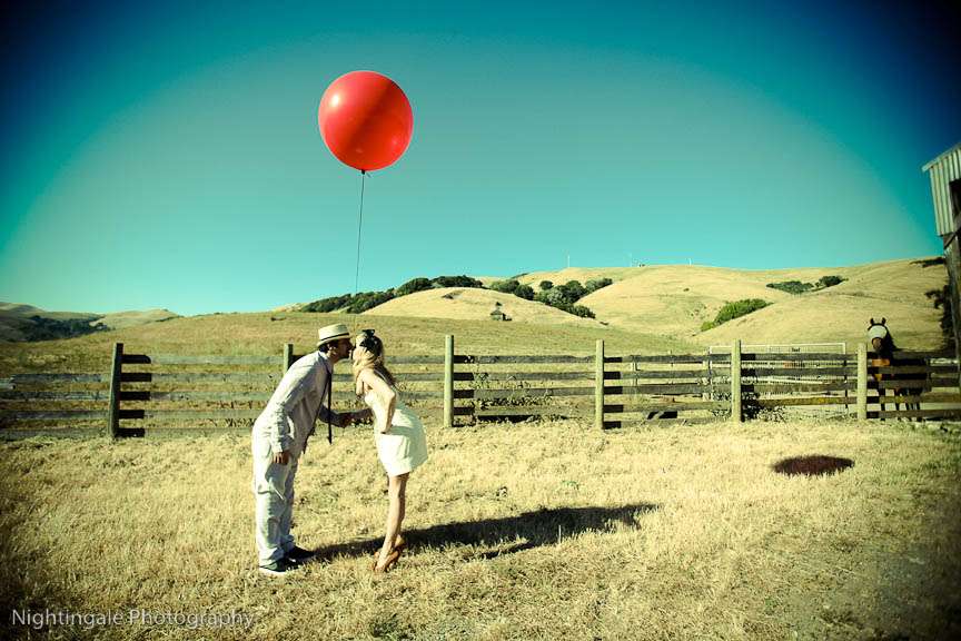 Edgy, retro, stylised. Athena & Branden’s gorgeous vintage toned engagement session took place in San Francisco. They used a red balloon, a vintage suitcase, a fabulous old car, a deserted barn and wildflowers to create this really whimsical, dreamy setting and overall look.