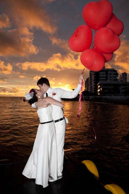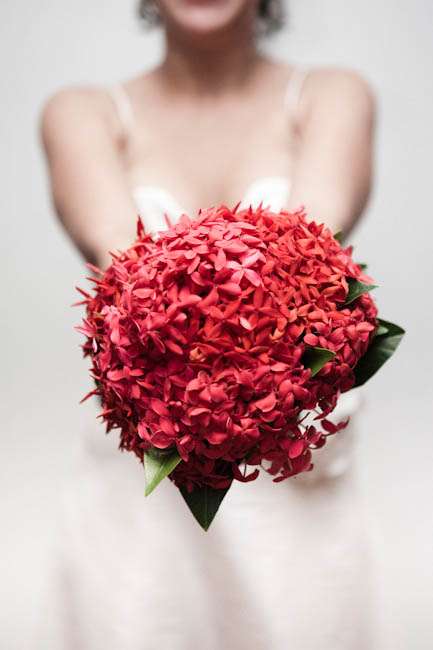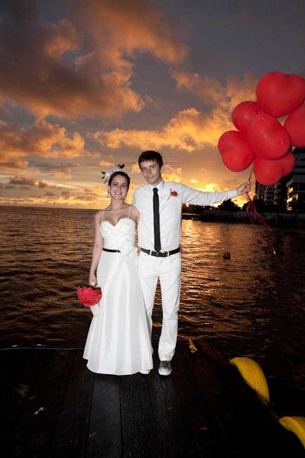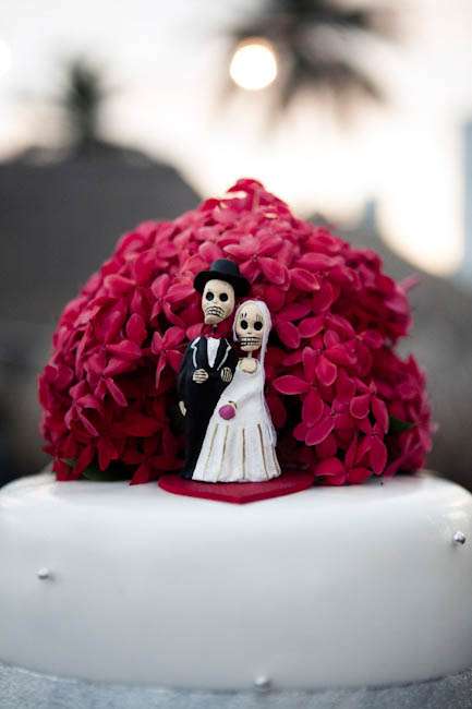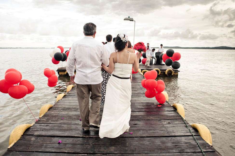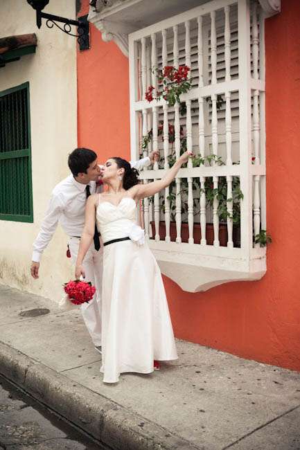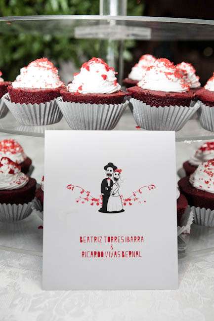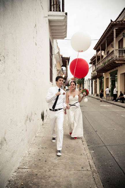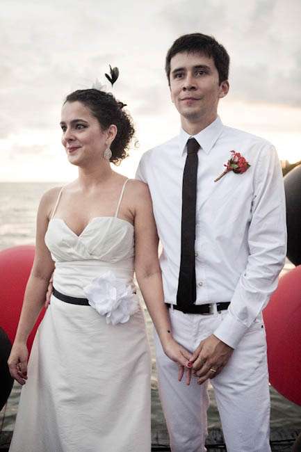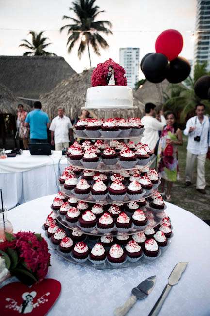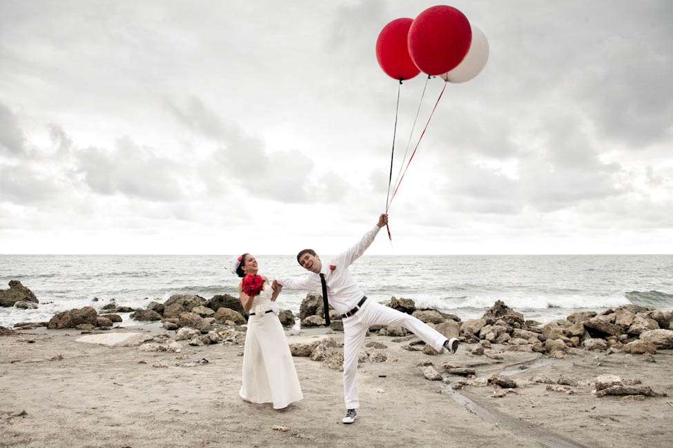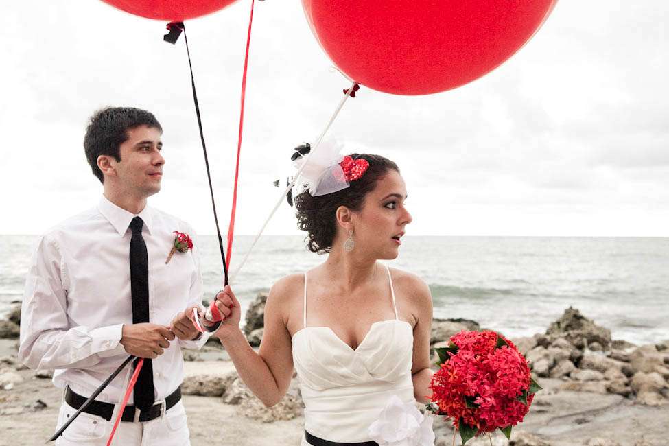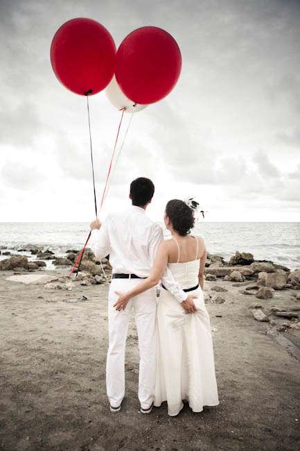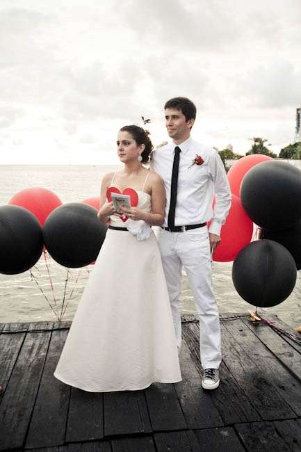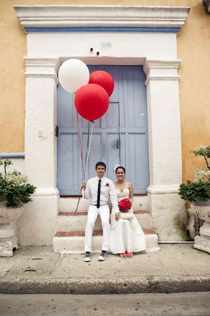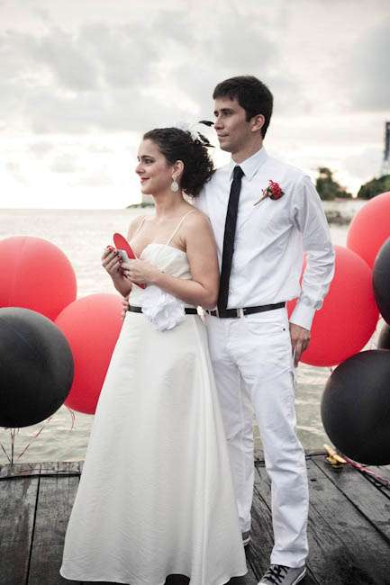 On the wedding day itself, the pair had another ceremony down by the beach followed by a fabulous beach party where they played Cuban music and served seafood, cocktails and cupcakes. “The initial inspiration of the wedding was the Mexican day of the dead cake topper that a good friend used as her cake topper in her wedding” Beatriz continued. “After watching the wedding in The Hangover, I fell immediately in love with the black accents in the dress and in the whole decoration, so we decided on having a black, red and white wedding. Because it was going to be on the beach we decided to use the most “beachy” flowers we could find, and the flowers you most see all over Cartagena are Ixora and Bougainvillea, which will also would give the red touch we wanted in the decoration. Of course the cake, HAD to be red velvet cake, which is not a common cake in Colombia and which I had to fight for. Seeing your site I knew I had to have balloons, so we had 50 of those gigantic balloons in red, white and black and 50 more in the shape of hearts. When the guests arrived to the club we gave them fans in the shape of a heart that had the same figures that were on the invitation with the words “Thanks for being with us” and the date.”