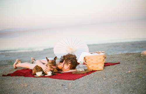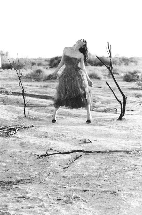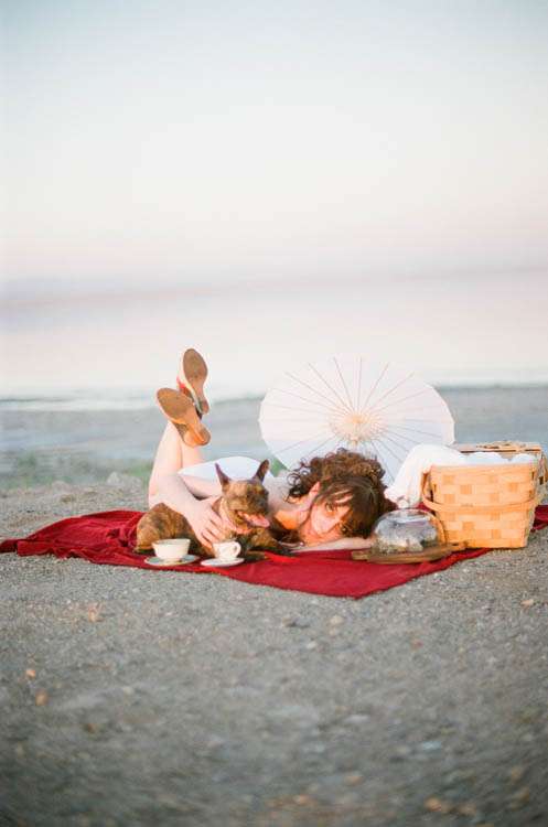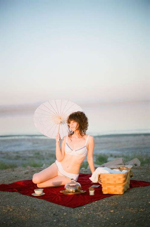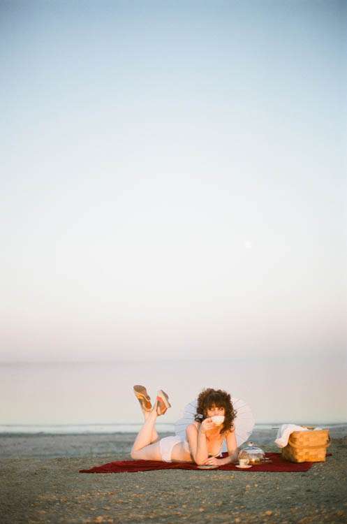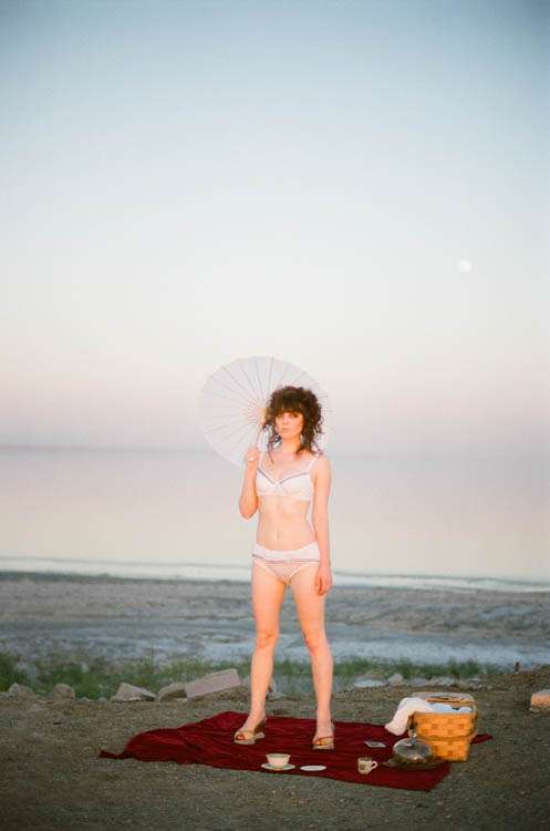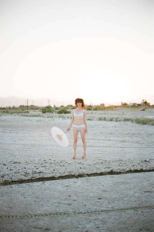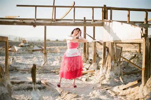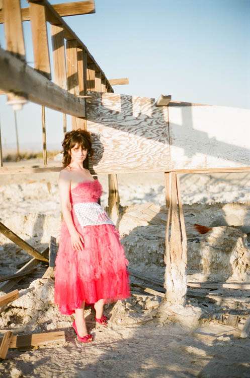 She continued “the second location, the Salton Sea, was just west of Salvation Mountain. In the 1920s, the Salton Sea developed into a tourist attraction, but the water became over-salinated in the 1960’s, which killed all of the fish and turned it into a desolate, salty wasteland. I picked up a small branch, encrusted in salt, with a dead fish stuck in it and smiled–which Andreanna promptly snapped. We were inspired by the ghosts of 1950’s housewives and a vision for the future that never happened: buildings collapsed into salty sand. When we moved to the “beach tea party scene”, the make-up (by Ashley Myers) was inspired by the fantasy/dream sequence from Tim Burton’s “Sweeney Todd”, in which Helena Bonham Carter fantasizes about a love that never comes true for her.”