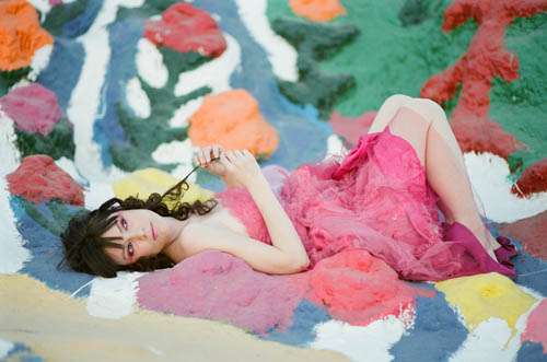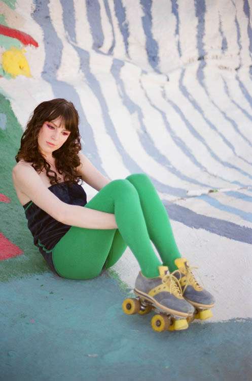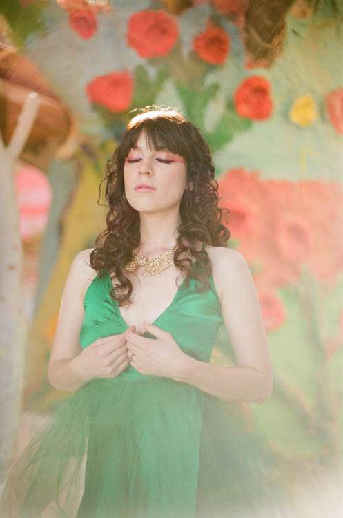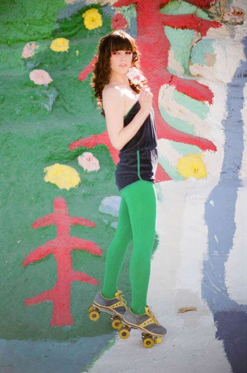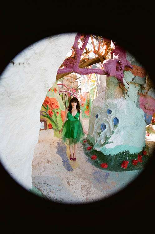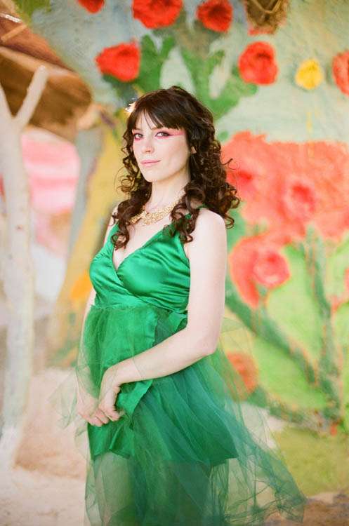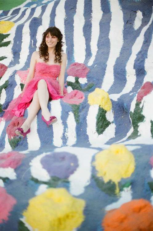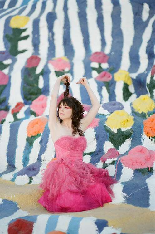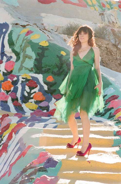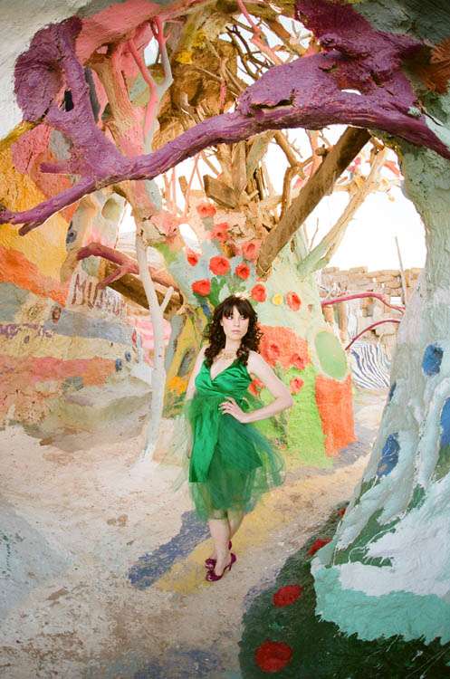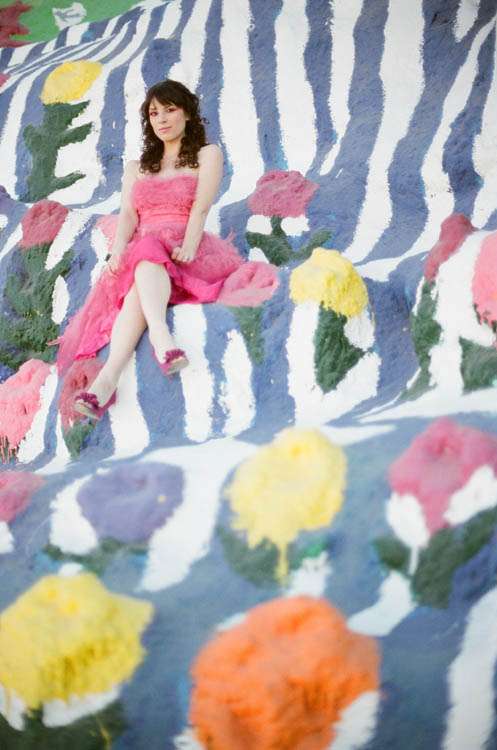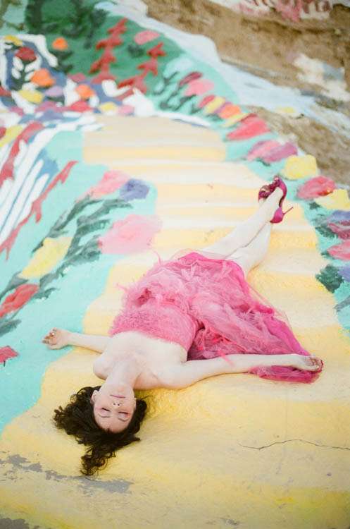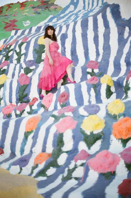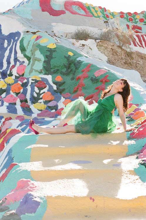 “The artist/creator of the mountain (who lives on-site, alone, in his truck), is a 79 year old man named Leonard, who has worked on it for the last 20+ years and continues to today. He invited us to take as many pictures as we liked and to stay as long as we wanted, giving us a tour mid-shoot, and bottles of water. We conceived of a Wizard-of-Oz-esque scene (with all of Leonard’s vibrant colors and existing yellow brick road), and since my dog, Batgirl was with us, she played the part of Toto. The dresses were designed by the talented Giuliana Mayo who made the pink dress specifically for my MTV Canada debut in June 2010. Giuliana is kind and brilliant, and has worked with Johnny Depp, Prince, Stephen Tyler, Britney Spears, The Red Hot Chili Peppers, among many other legends. It was an honor to wear her gorgeous designs.”