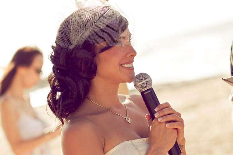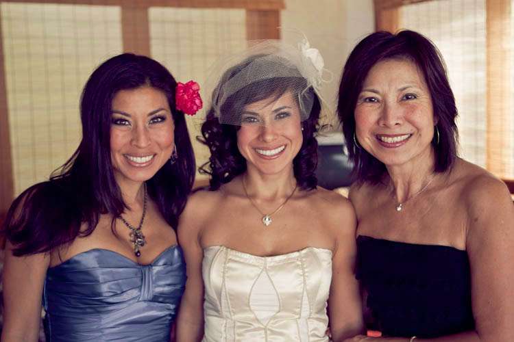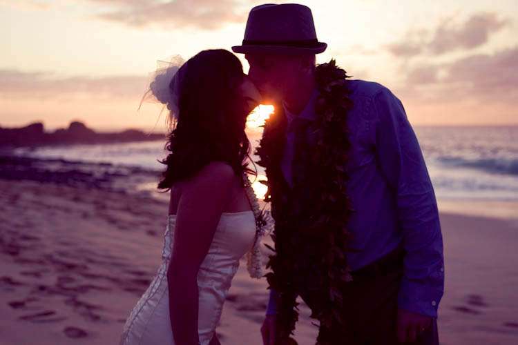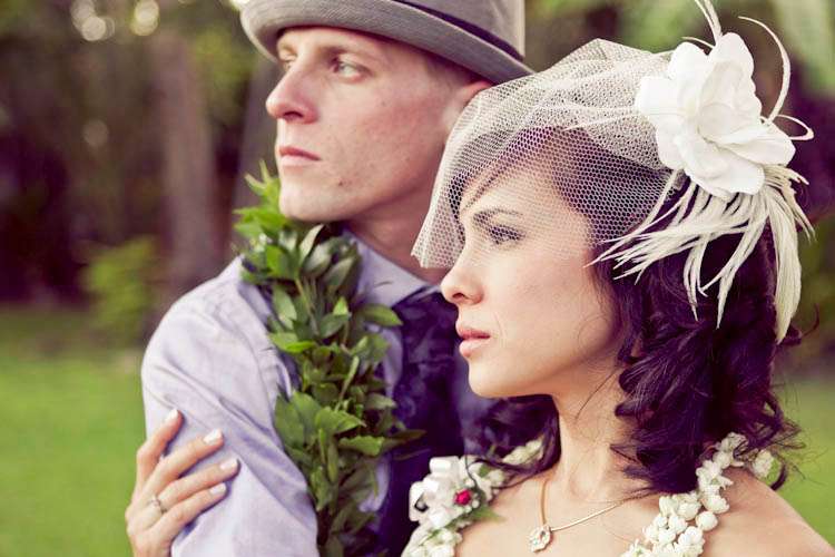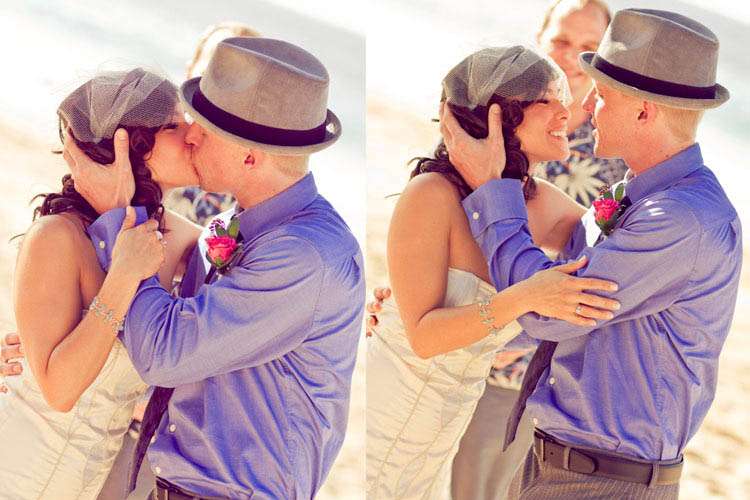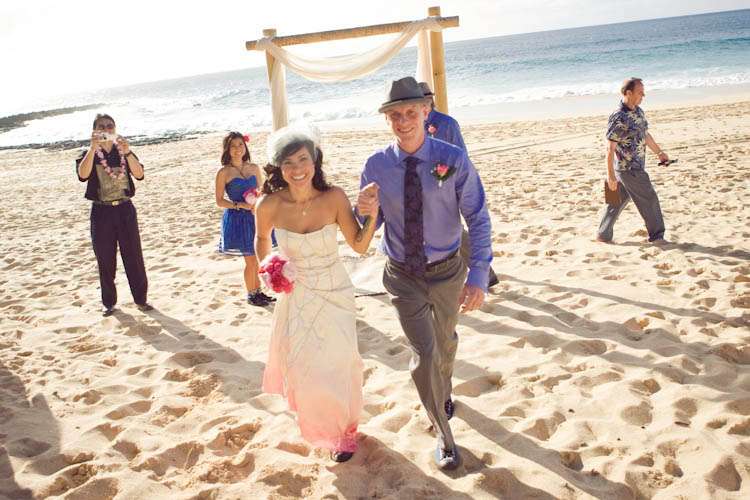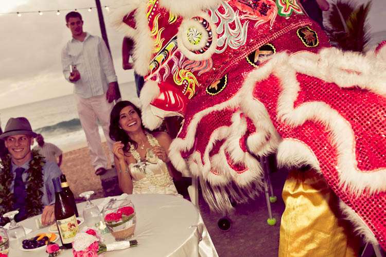 They went diy crazy and did a lot of the wedding themselves – from the flowers (which they bought wholesale) to the homemade veil. “We really wanted our wedding to be a ‘non-wedding wedding’ that was as unique as we were and at the same time have a super fun beach party!” Kim told me.” We also wanted to involve our family and friends… so thankful we have so many creative people in our lives to help (flowers, hair, make-up, firecrackers!). Even though I didn’t buy one bridal magazine or try on any dresses, I definitely perused the wedding-porn online that was tailored for the independent thinking brides. We didn’t want to give in to the ‘wedding industrial complex’ and doing things the way they are “suppose” to be. I think that I’ve always been a non-traditionalist which is why I chose to forgo the cliche white dress and khaki Hawaiian beach wedding for one that was more colorful, stylish, elegant but still casual enough for the beach. We had an amazing time with all of the special people in our lives in a place that is very special to us.”