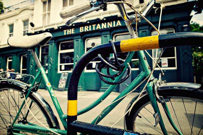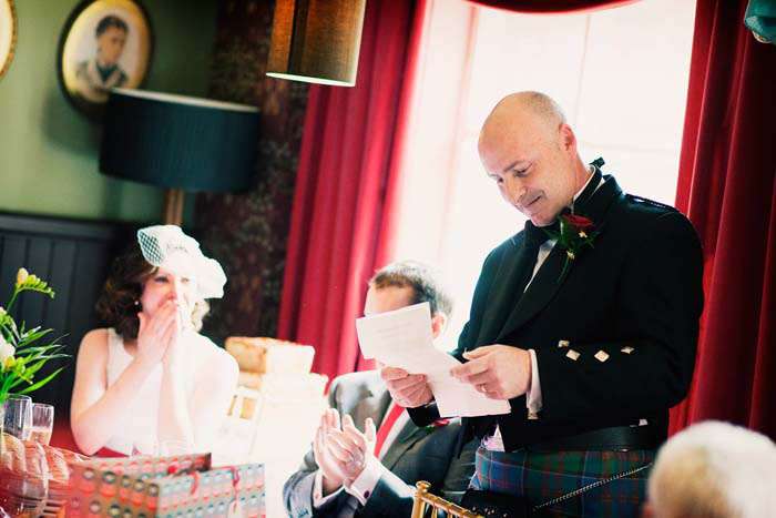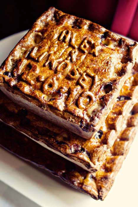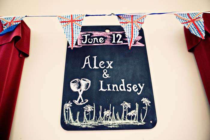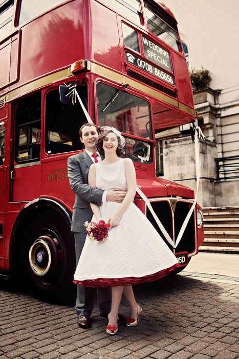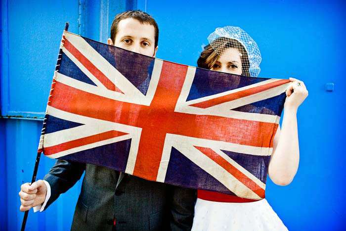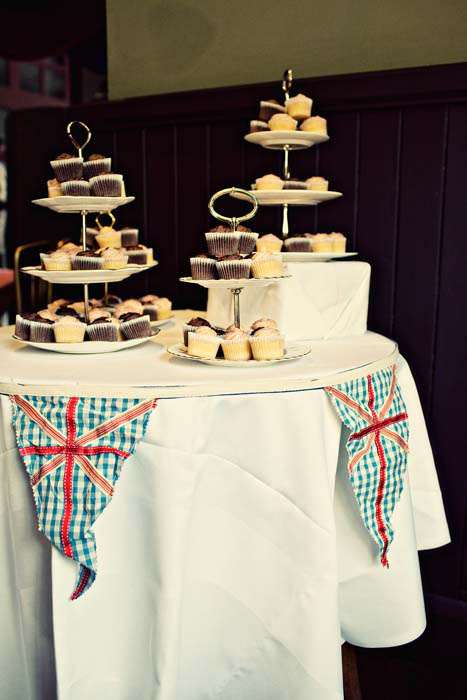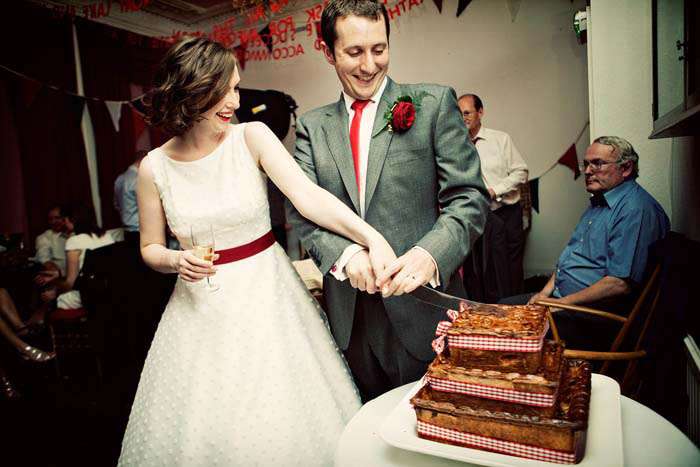 The couple embarked in a lot of diy to make it all super personal and everything from the pub they held it in being called The Britannia to the pork pie ‘cake’; from the Vivienne Westwood shoes (a national treasure in my eyes!) to the red, white a blue throughout were put together to make their theme perfect. The bunting had a union jack vibe, the table plans were quintsentially British themed and the guests were even transported in a open top double decker routemaster red bus.