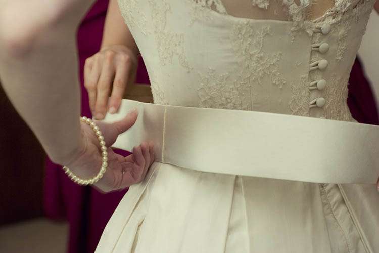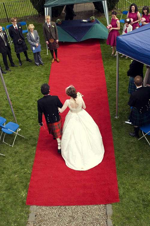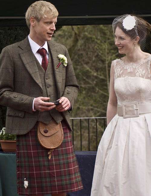 Nicola looked gorgeous in a Stephanie Allin dress, “My dress was another relatively quick decision, I found it in Eleganza Sposa in Glasgow, the first shop I went to, and it was one of the first dresses I tried on. As soon as the dress was on, I knew it was perfect, and I could tell by my mum’s face that she agreed. I was kicking myself for even trying it, as I knew it was too expensive for me, so I left it. I tried on no others, and months later, the shop offered to sell me the sample dress at a reduced price! As the dress was 50s style, I wanted to get the bridesmaids a similar style, but knee length. I got them made by Amanda at Rene Avonya,who was great with her ideas and flexibility. I hadn’t planned on a deep pink, as none of the girls are particularly “girly”, but they looked great on the day and suited the colouring of the bridesmaids.”