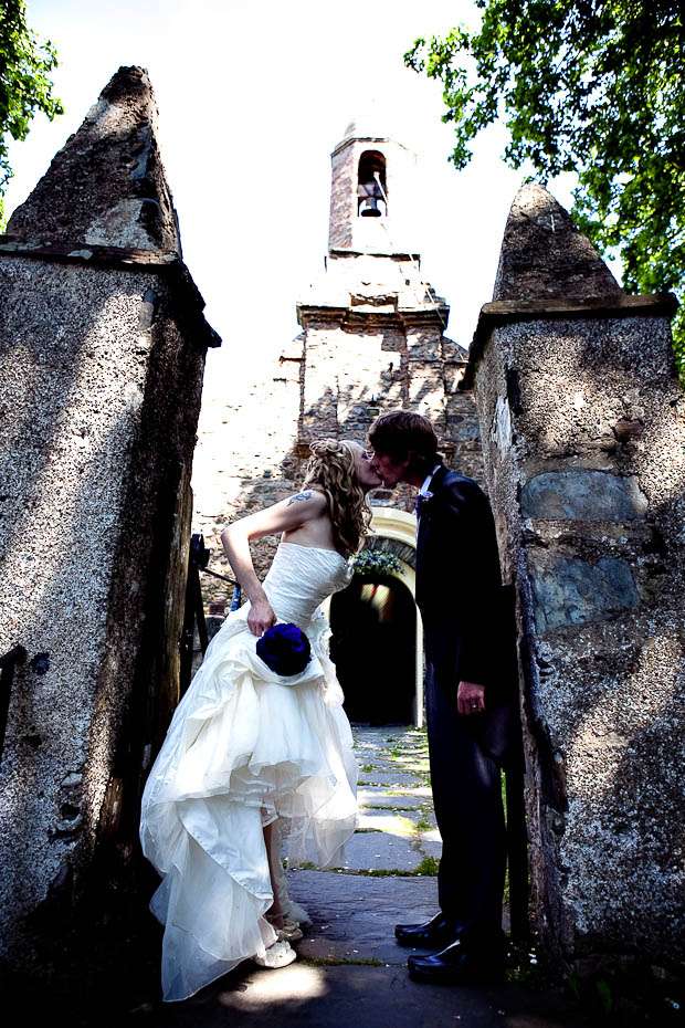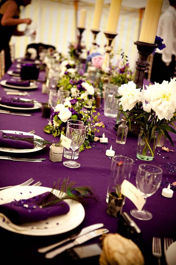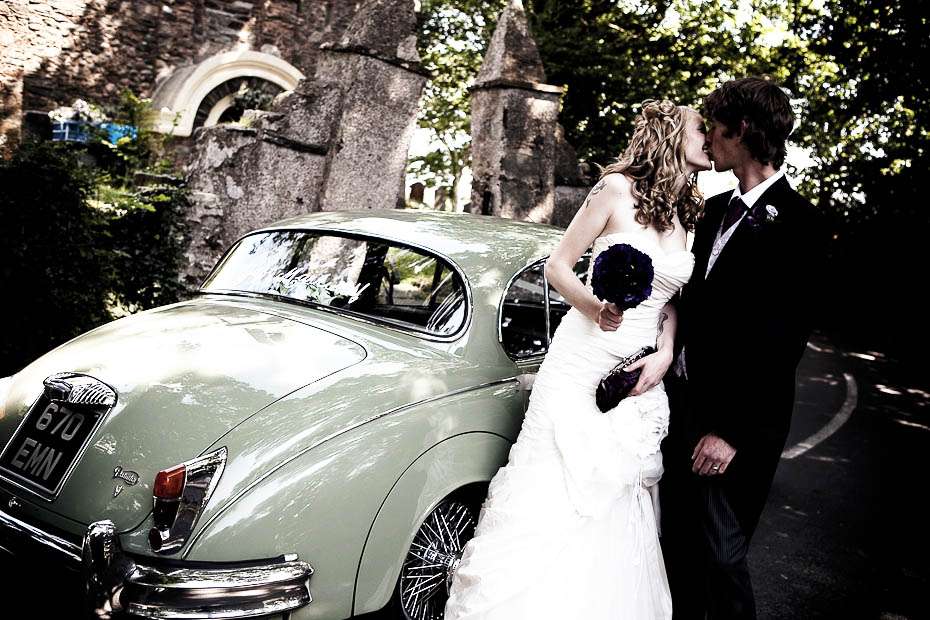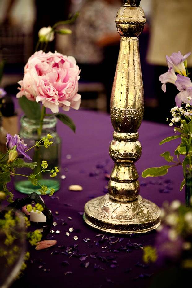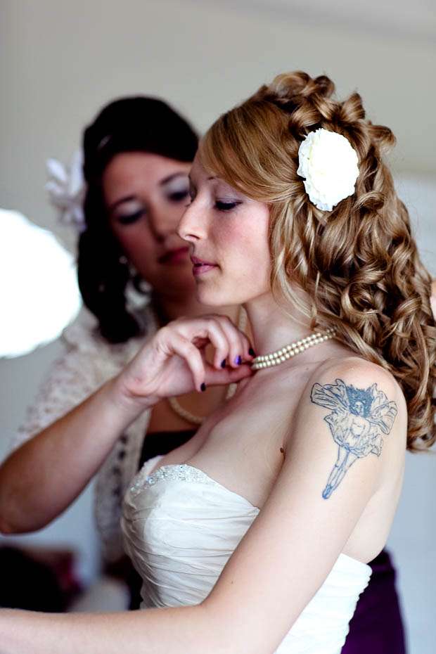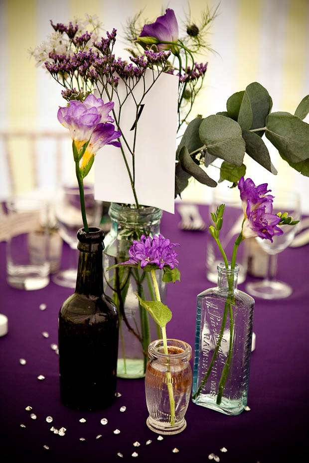Jenni & George are another ‘inspired by Rock n Roll Bride’ couple who found their photographer Shan after she was featured on the blog. The couple, who got married on the Isle of Man, wanted to incorporate he things they love into their day – the colour purple and all things eclectic, antique and vintage. “I have a love of all things antique and vintage and my favourite colour is purple! So that’s where it began. I bought a lot of the antique bottles from places like eBay, Jurby Junk (!!) and our friend Roger Leece, who found a whole stack of bottles and jars buried somewhere up North apparently!” the bride told me.