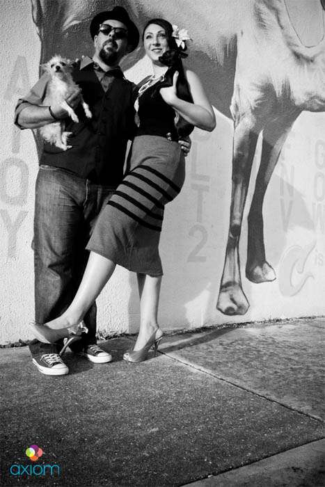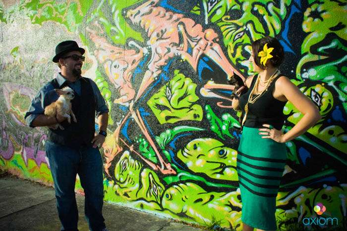 Amanda & Marcel’s Florida engagement session was a gift from their friend Mireya at Axiom Photo Studio. “From the moment Marcel and I got engaged, Mireya called us up and said…’I have a vision’ ” Amanda told me. “She told us where and when to meet and she would take care of the rest. I decided to hit up a few Goodwill stores the night before and ended up getting my entire wardrobe for under $20. She knew she wanted to capture “us” and “Miami” and she really did. She took us to some kick-ass graffiti walls in Wynwood and then we traveled back to Little Havana for some cafecito. The whole shoot took about four hours and we all had a blast (including our 2 chihuahuas).”