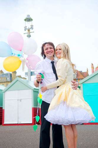 “My dress was a £35 vintage buy from Beyond Retro in London” she told me. “It was a beautiful colour and fit on top but quite an unflattering length so I customised it by layering it over a fab multi-layered white underskirt (also from Beyond Retro) and using my handy little microstitch gun ( a brilliant gadget if your rubbish at sewing but like to tinker with clothes) I pinned it up quite high keeping lots of fab underskirt on show. I wanted it to have a bit of a young victorian girl at the seaside feel, toffee apple in one hand, balloon in the other, hitching up her skirts to paddle in the waves. Thought this seemed fitting to a wedding in Brighton.”