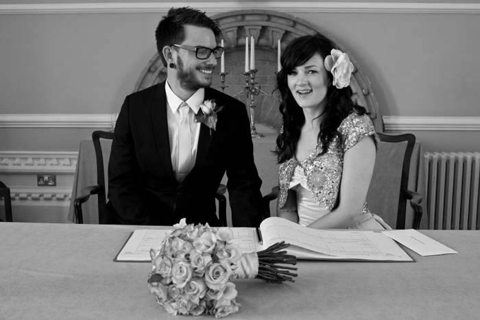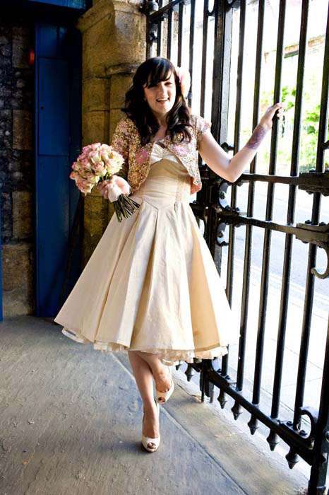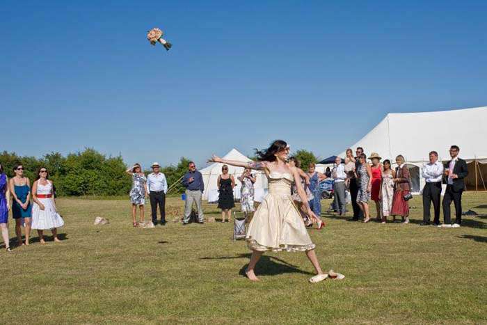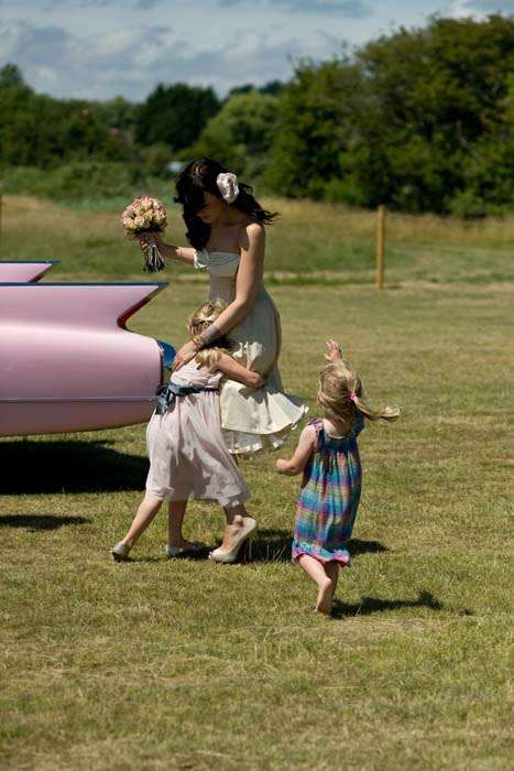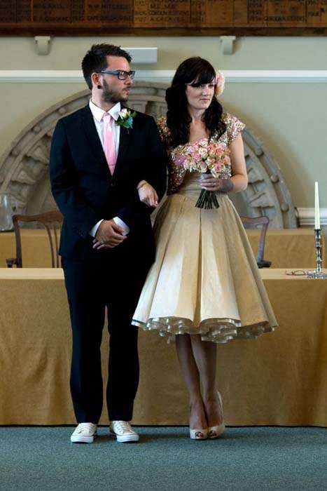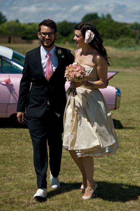 Ooh what a lovely sparkly rockabilly wedding! Lucia & Pete got married at Arundel Town Hall, West Sussex which was followed by an outdoorsy reception at the bride’s sisters camp site – Billycan Camping, Arundel – which specialises in bringing back traditional camping, with bell tents, safari lounge tents and Teepees! “We wanted to create a family orientated wedding” Lucia told me. It was held in my hometown, my Mum did our photos, my Dad made the rings, my Mother in law made the cake and the whole thing was held at my sisters campsite. Fun, laughter and a relaxed environment was important to us. We’d been to so many weddings where we felt on edge (due to not knowing everyone) and we didn’t want that from ours. It was a buffet lunch that was solely Vegetarian and the tables were decorated with gold sweetie bags with fake tattoos beside them- these were red hearts with a scroll across- reading “Pete & Lucia” something that went down amazingly well with the children.”
