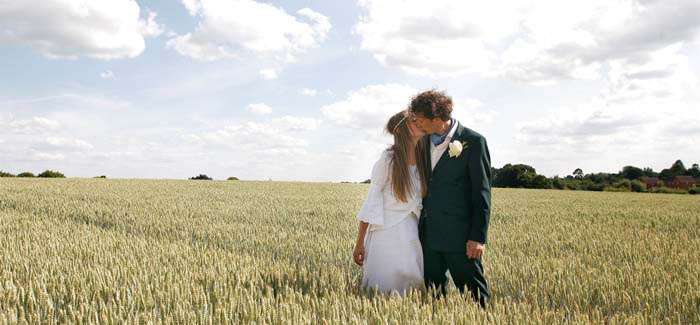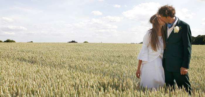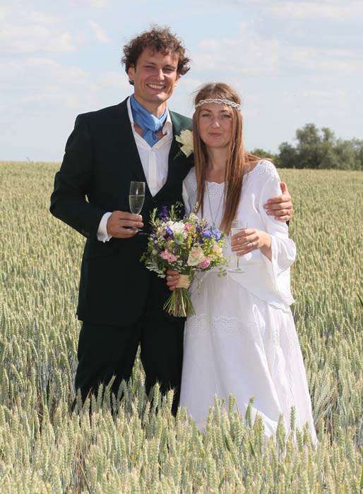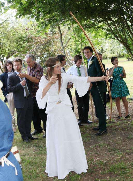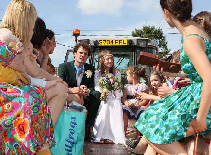 Architects Sybil & Jon planned an outdoors, Robin Hood style wedding – complete with campfire, archery and tents – at the bride’s parent’s house, for July 30th this year. Jon explained that they wanted the ‘feel’ of the wedding to be similar to the scene in the woods from the original film of Robin Hood. They wanted everything to be relaxed and very informal and so had tractors as their transport, a folk band and a rustic, natural style of flowers. “Sibyl was very keen to use English flowers and wanted them to look like they had been picked from the garden.” their wedding planner, Kate told me. ” Anne Bell sourced the flowers from a walled garden in Hertfordshireand created beautiful colourful arrangements in jars on each of the tables along withbouquets for Sibyl and her bridesmaids. The church was decorated witha stunning candle stick display and pew end arrangements tied with raffia. As an added touch the couple also quickly decorated the tractor!”