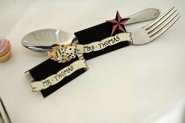 The couple diy’ed all their stationary – in a vintage tattoo style. The boy’s place names had flaming dice and the girl’s had pink nautical stars. They made the table planner with a big piece of MDF covered in a tattoo print fabric from Etsy. They had friend make the cake in the same tattoo theme.