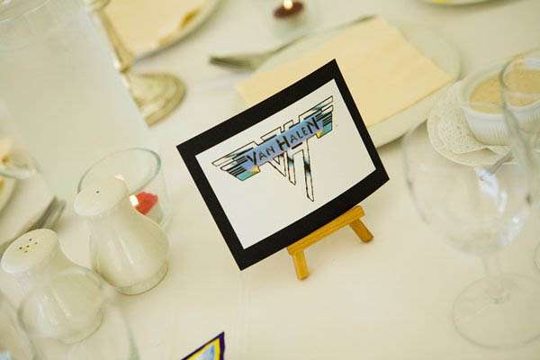 The tables were named after all their favourite rock bands – Kiss, Whitesnake, Guns n Roses, Alice Cooper, Thin Lizzy, Iron Maiden, AC/DC, Van Halen and the top table was The Ronnie James Dio table. For a really personal and fun touch their favours were mini cupcake lip glosses for the girls and polystyrene gliders for the boys. They also had dishes of haribo rings and hearts on each table (yum!)