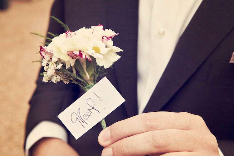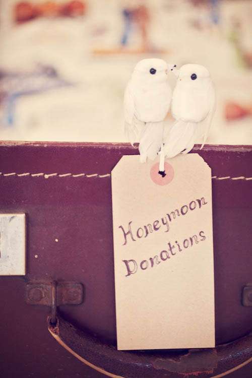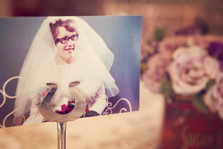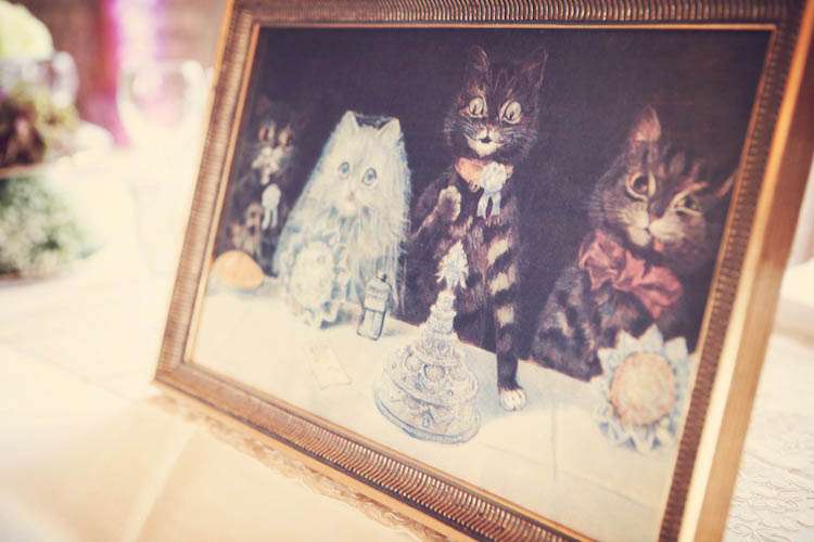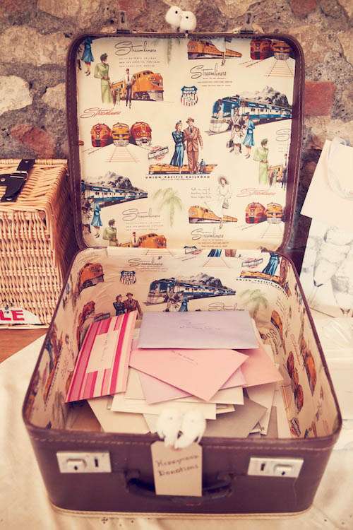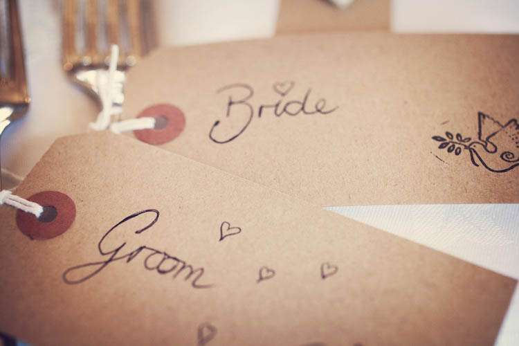 Finally, they chose to have pictures of kitsch weddings instead of table numbers to show where the guests what table they were to sit at. They used old fashioned luggage tags as place name settings and the bride hand wrote them herself.