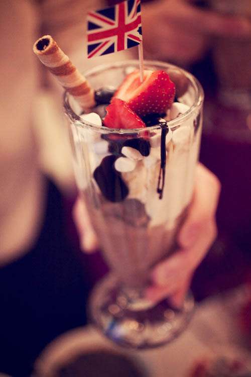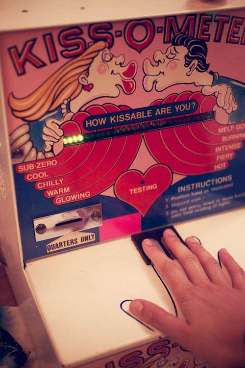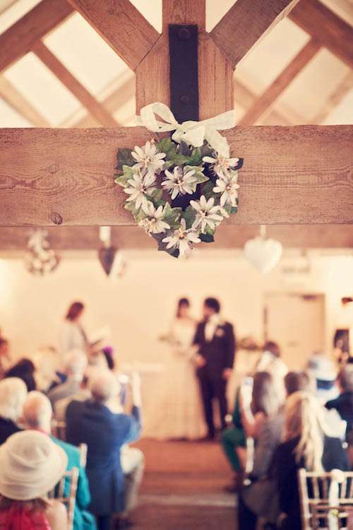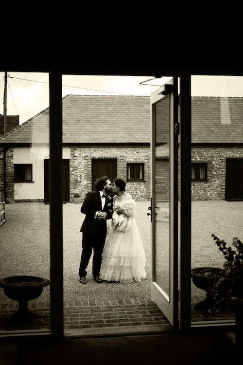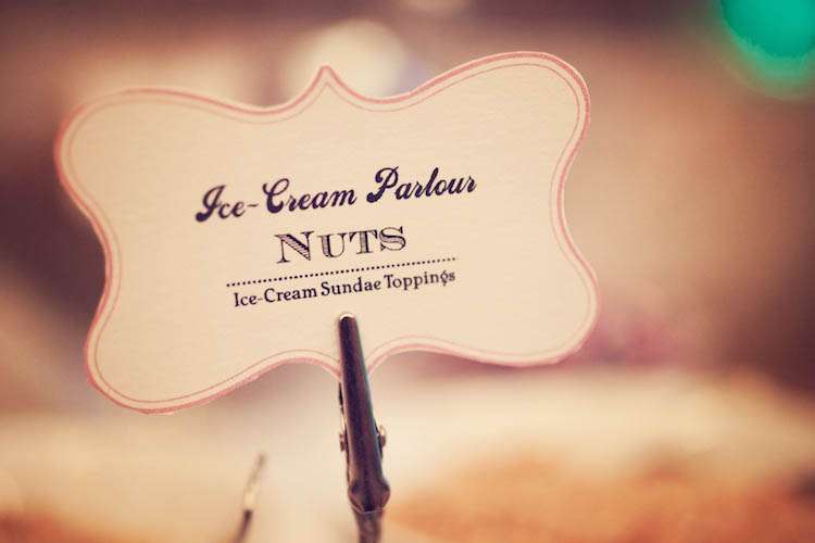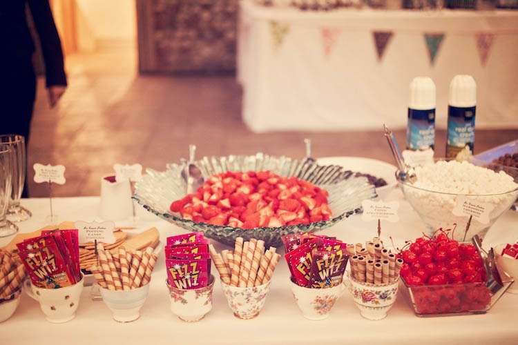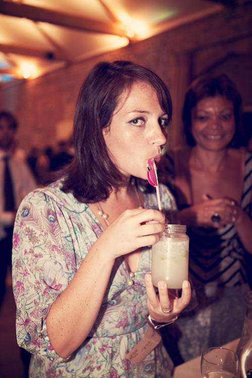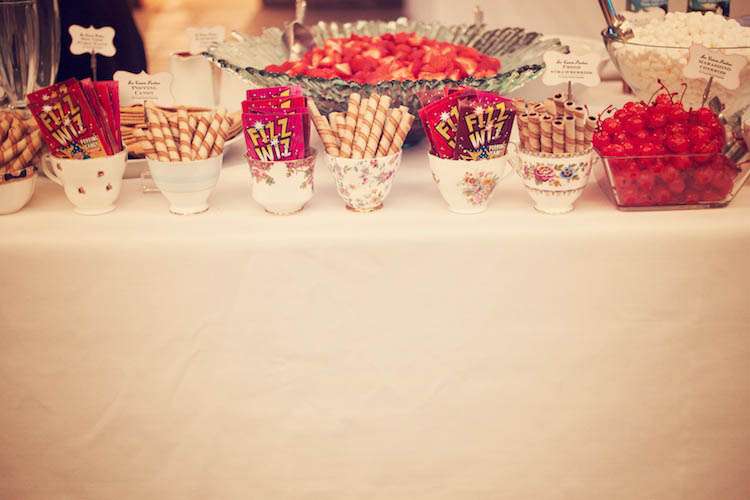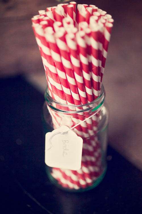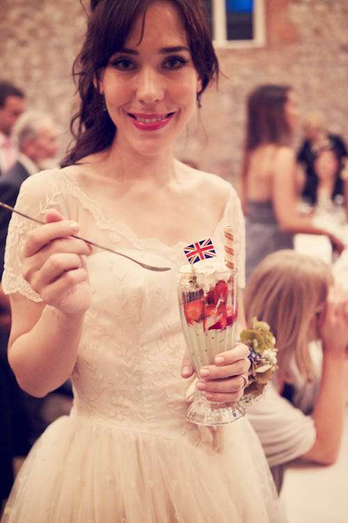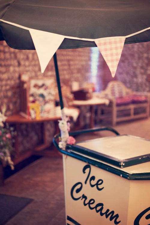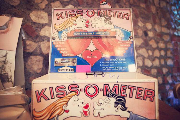 “Our inspiration was easy we just collected things we love and are interested in,” the bride told me. “I love all things vintage because I love that it has history and seems to have so much more personality than many modern things. I find that vintage things were made to last and made with care and skill unlike most things today are made to be disposable and are not designed to last. I wanted our day also to have lots of elements of fun so I came up with the idea of an ice cream sundae bar so guests could be kids again, make a mess and choose whatever topping they wanted! We also bought a kiss-o-meter for a bit of fun, it was from an American site and was from the 60’s. In the reception barn at Farbridge they also had a projector. One of my favourite films is Cinema Paradiso, there is a scene at the end of the film which is called the kissing scene which features lots of kisses from famous old black and white films. We played this scene on repeat on the the projector to add another dimension to the room. We had a wedding cocktail which we served in jam jars and bought some quirky straws too.All these things were good talking points for the guests and added elements of fun and interaction.”
