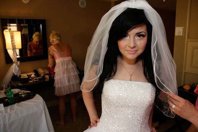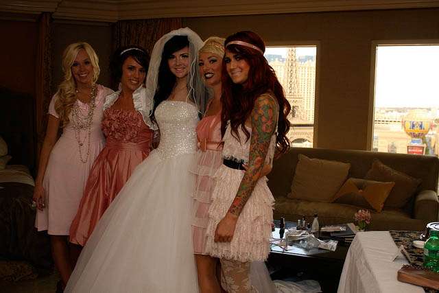 The bride is a make up artist so did all her hair and make up herself. In fact she seemed to almost enjoyed the getting ready part of the day as much as the actual wedding bit! “I spent the morning with my bridesmaids doing make up, eating gummy dice and card cookies (amongst other treats). We had an amazing bridal photo shoot in the atrium at Bellagio where we captured some sweet Alice inspired photos. Which is totally fitting since my husband is related to the real Alice in Wonderland, Alice Liddell (can you say “keeper”?). I wore were 6 inch heels entirely covered in Swarovski crystals. Needless to say the bridal shoot stopped traffic.”