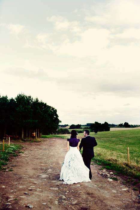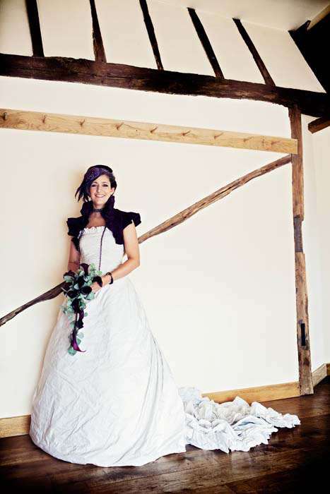 The colour theme that ran throughout the day was a dark purple and the bride wore a stunning Ian Stuart sample dress which was a pale blue/grey silk with a dramatic deep purple bolero which she bought from Bonzie on. To this she added a fabulous hat that she made herself by stitching together various bits and pieces which she had collected – including feathers, fabric, pearl beads and netting. Finally she added purple ‘Mini Magic Floral’ Irregular Choice shoes which she bought from Schuh. “I bought my dress at a wedding fair in London for £1,400, which was half price . It was far too big, so I had a dress-maker take off about 3 inches either side until it fitted. It was made in a pale blue/grey silk. I was quite pleased to think that because it was a sample it was completely unique and no one else would ever have one like it. The dress wasn’t what I thought I’d ever go for at all – quite traditional really with a huge train, but the colour made it unusual, and I accessorized it in quite an unusual way. I love Victoriana, which it reminded me of, and in the end I thought ‘when am I going to get the chance to wear something like this again’ so I went for it. My accessories were chosen to be in keeping with the Victoriana feel of the dress, and the idea was to make the outfit appear less bridal and more edgy.”