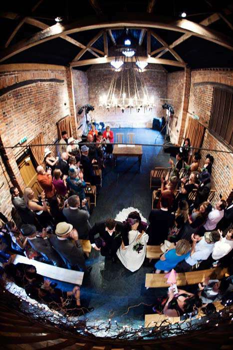 “We took the mad-hatter’s tea party idea and the magic of the ‘eat me’ cakes and ‘drink me’ potions, and linked it to Carroll’s poem Jabberwocky,” the couple explained. “This nonsensical but menacing poem appeared on our order of the day, and provided the inspiration for our table names. We wanted the wedding to have a fun party atmosphere and not be too ‘themed’, so we combined a ‘bring a hat’ dress code with teapot centre-pieces and little bottles of alcoholic shots on the tables labeled ‘drink me’. We wanted it to feel darkly comic, fun and quirky, whilst still being an emotional and special day for us.”
