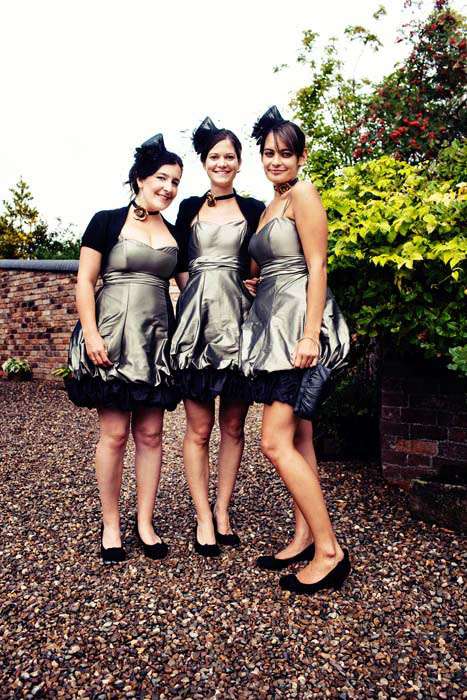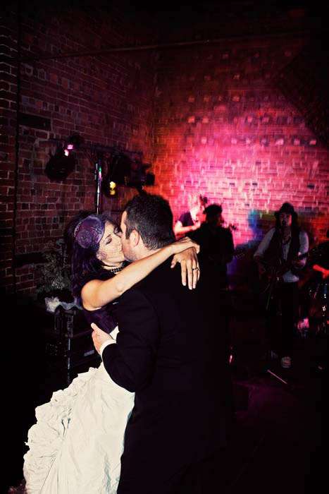 “Our inspiration was to some extent ourselves,” the couple concluded.”We never wanted a traditional pink roses-type wedding. Steph loves horror movies and I love period dramas, so in the end we tried to go for something that reflected our personalities – I was thinking vaguely of Tim Burton’s Alice in Wonderland – slightly macabre. We knew we didn’t want anything formal or traditional, and once the band agreed to play, it all started to go really rock and roll. I liked the fact that the bridesmaids dresses didn’t match the colour scheme and it didn’t really matter – also, they looked like amazing sexy burlesque dancers which was ace.”