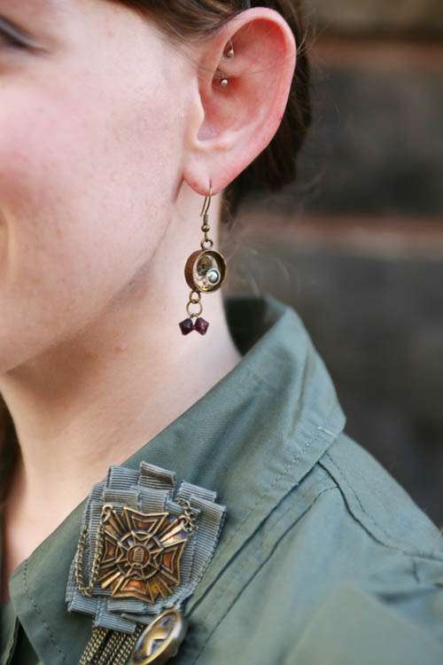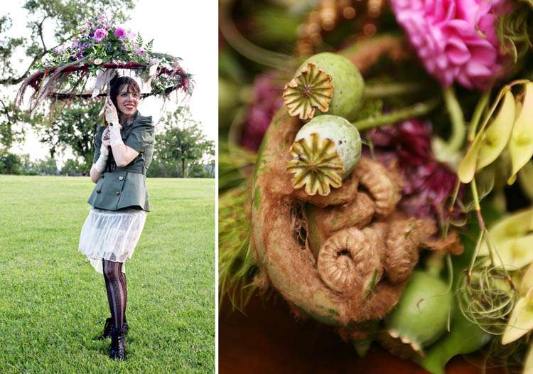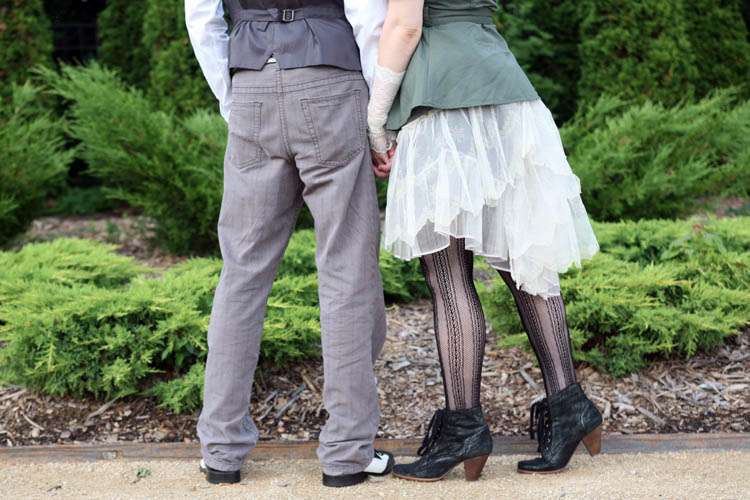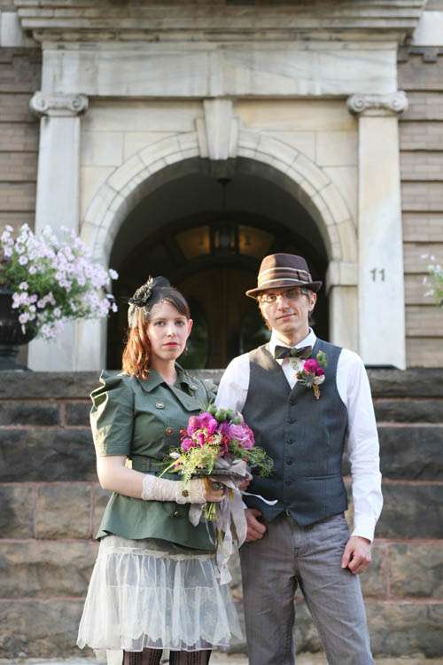 Wendy & Brian were celebrating 5 years of marriage and wanted to do a steam-punk styled shoot. Brian creates some really cool tie tacks, cuff-links and earrings etc and sells them on etsy, so it was also a good excuse to showcase some of his work. Photographer Katrina made the seating cards and all other paper goods, and she worked closely with Pazzobello Floral Design on the flowers and table settings. “I love how out of the box she was,” Katrina told me. “She incorporated gears and re-purposed pieces for the table arrangements and bouquet to really fit the theme.” The china was from Katrina’s Mother’s wedding china.