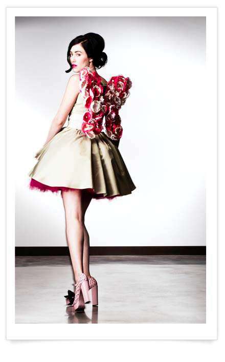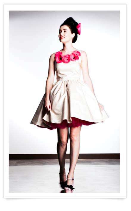 The Fall 2010 range currently has 11 designs in it – from the short and spunky to the long and glamorous. All of the dresses are bespoke & made to order and to your specifications and are created from 100% silk or organic cotton. Each dress is fully lined and all of the embellishments are hand-done by Princess Lasertron herself. “Getting a package from me is fun because I wrap it all up beautifully and include extra goodies,” she told me (and I can personally vouch for that beauce I bought a headband from her a while back it came in pink tissue paper!) Each design is custom-made so can be made in ANY size. Simply drop the Princess an email for more info.