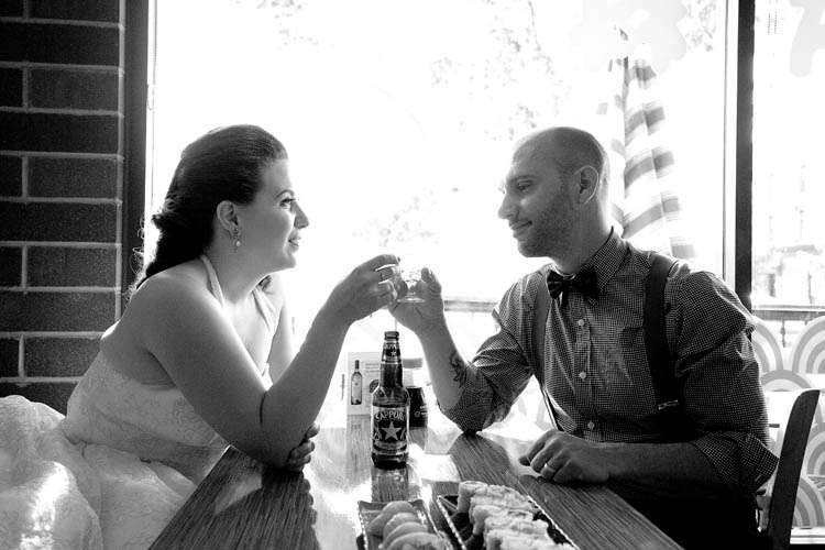 The couple’s very first date was at Nikkyo Sushi on Main Street in Vancouver which just happened to be around the corner from their reception venue. So, for some fun wedding day pictures, the couple and their photographer Lisa headed out to have some sushi & beer. The couple also served sushi from Nikkyo Sushi at their reception!
