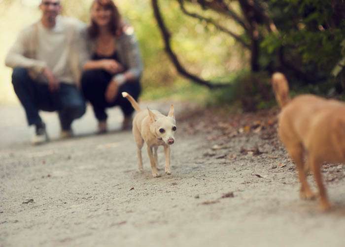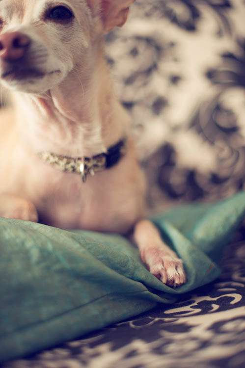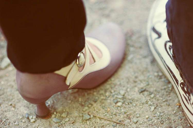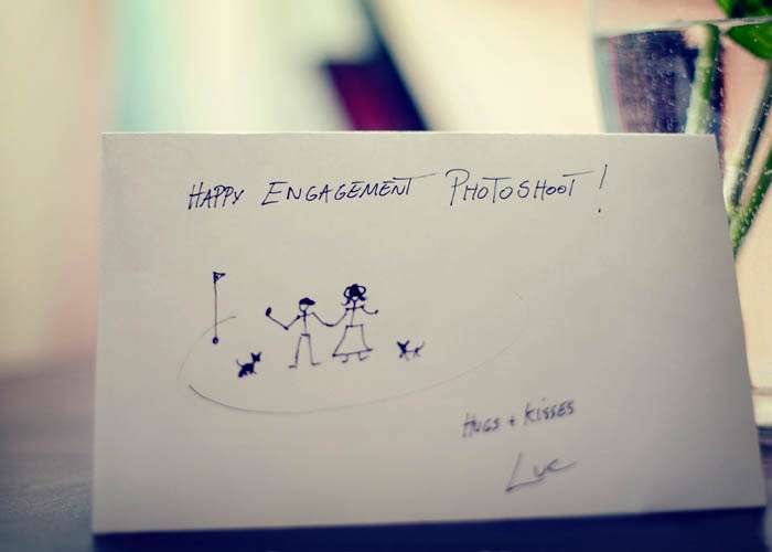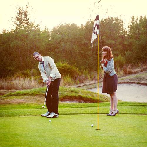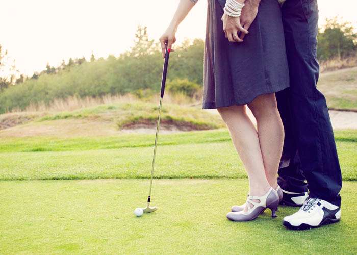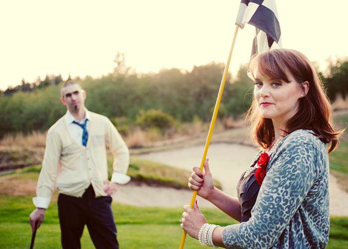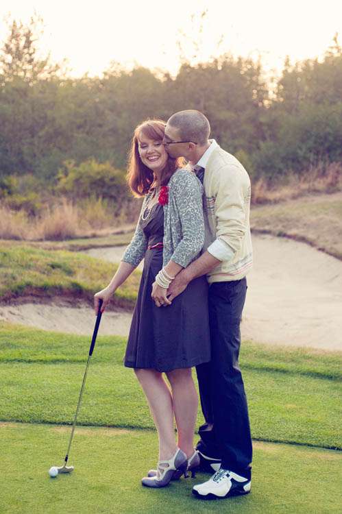 Angela, her fiance Luc and their two chihuahuas Minou & Birdie (there’s no way we can ignore them!) had a beautiful session to celebrate their engagement. The couple, who will be marrying in Mexico next May, wanted a variety of shots from casual ones with the dogs to ones with ridiculous props and finally to a few on a golf course. “Because my sweetie loves golf we went to a golf course and tried to have a vintage feel to the pics… Don’t know how much of a vintage feel we got but I don’t care – I love them!” Angela told me.”I love that our photographer got pics of my purple fluevogs and Luc’s black sabbath converse. She even took pictures of a silly card Luc made for me while they waited for me to get home from work, and pictures of the dogs on the couch posing.”