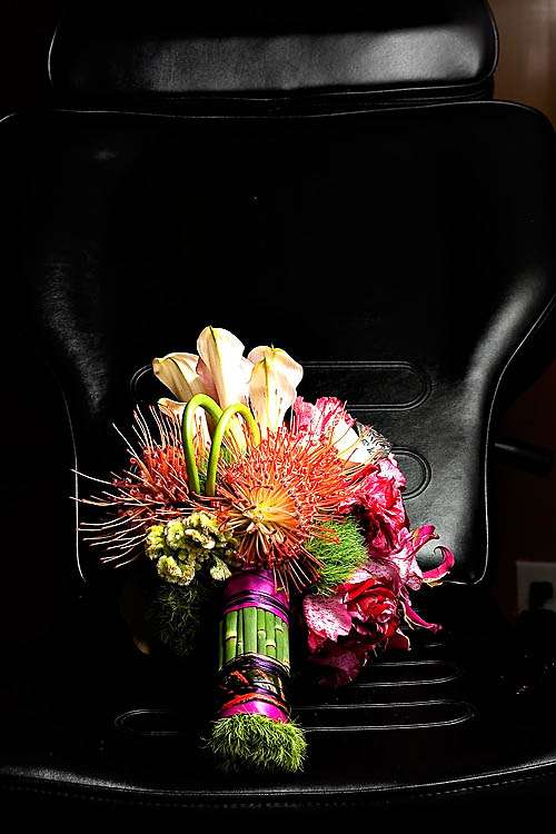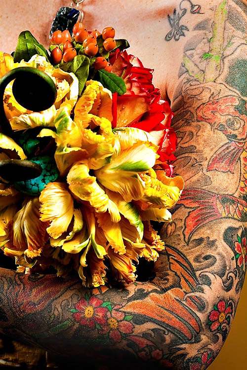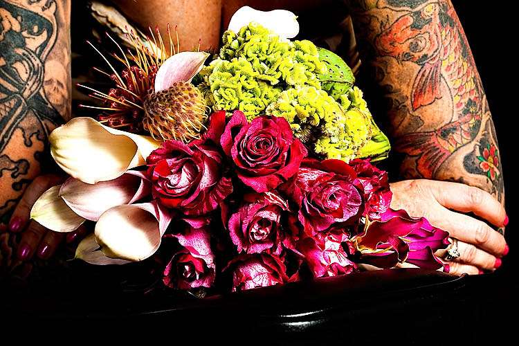 This funky photo shoot was set up by Michael Andrews and Flowers by Susan to showcase a different side to floral arrangements – matching them with your tattoos! They asked former client of Susan’s, Danielle (who is a tattoo artist) to model for them and they shot the series in her shop.