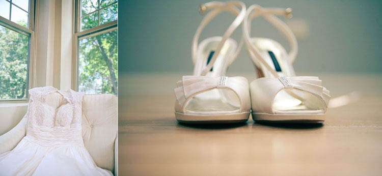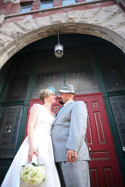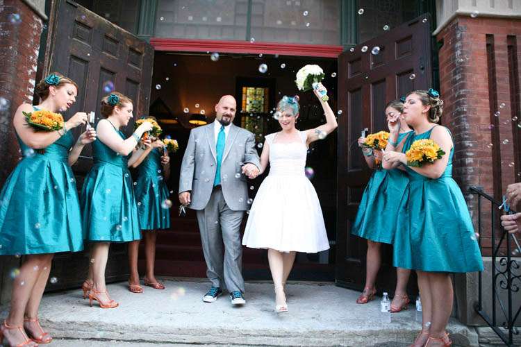 The bride knew she wanted a flattering tea-length dress but after a fruitless search in dress shops and even online, she decided the best way to get her perfect gown was to create it herself. She went to the drawing board and drew out her ideal dress which she then brought to a seamstress who worked with her to make it. She accessories with a blue birdcage veil which she picked up from a vintage shop in Chicago. She picked the colour to match her bridesmaid’s dresses. Finally, to complete her look she wore one of a kind jewellery all made for her by friends.