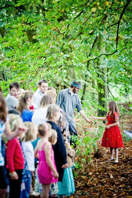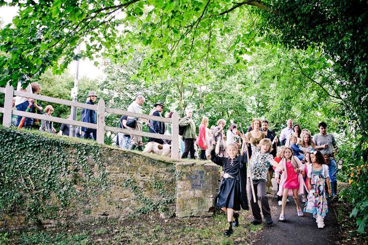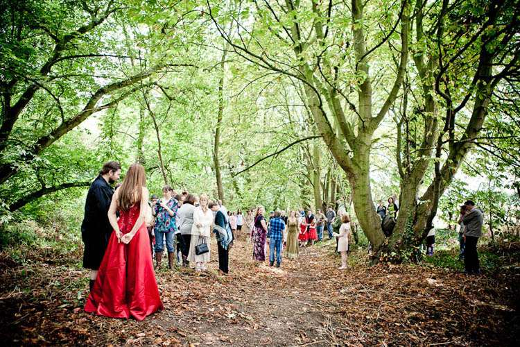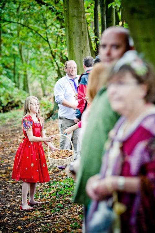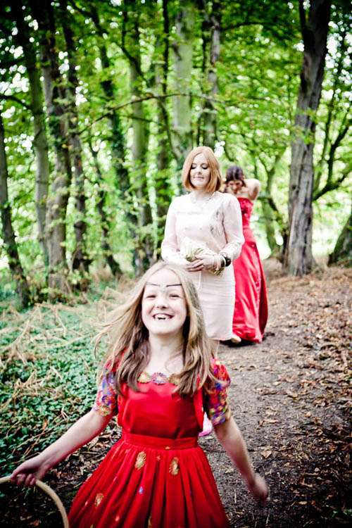 Rachael & Rafe were uninterested in a traditional religious or civil ceremony so decided to get married on their own terms. They were wed by one of their closest friends, Tara, in a pagan hand-fasting service which took place outside, in a small copsed wood locally known as “The Spinney”. They knew very early on in their planning that this was where they wanted to get married as the couple had spent some time living on a narrow-boat on the river, and for that period The Spinney was their garden, “It was where we hung out, relaxed, partied and where our children played. It is full of trees and love and so naturally the first place we both thought of for our ceremony” the couple told me.