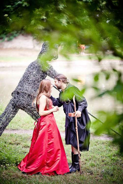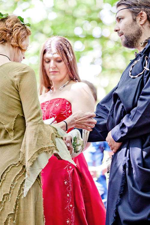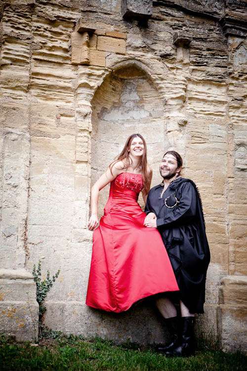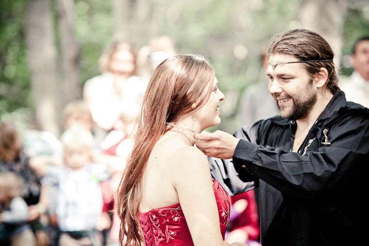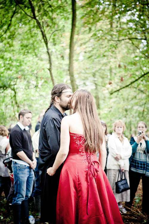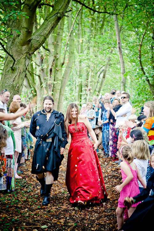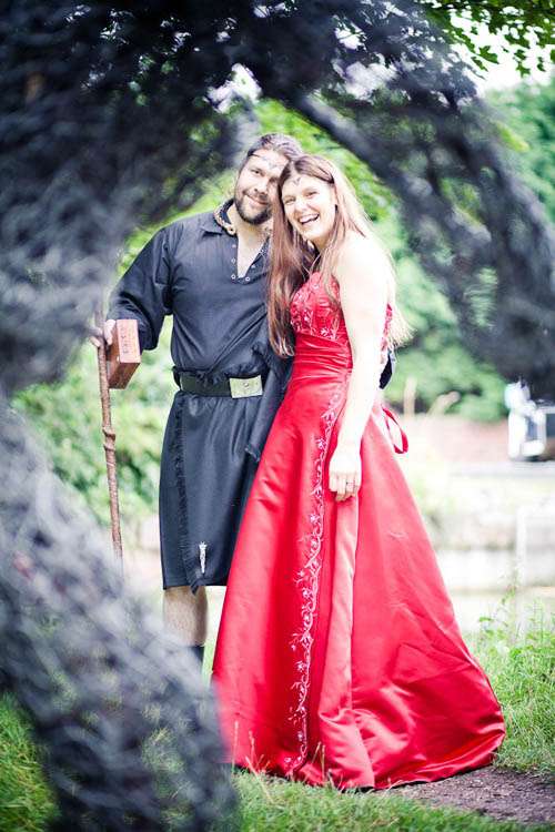 Rachael wore a red Maggie Sottero gown called Courtney. Originally the bride’s sister talked her out of getting a red dress, but at the last minute situations changed (ie her Grandmother who was going to make her an ivory dress but broke her foot so was unable to make the dress) so the bride was able to go with her gut and bought the dress she’d always dreamt of. She teamed it with a headdress she had bought the previous July from a stall at Faery Fest Festival. ” I took my eldest daughter and my friend took her eldest daughter to the Faery Fest where we found not only the headdresses and the dress that Tara married us in, but also The Dolmen, a pagan band who are just awesome.”
