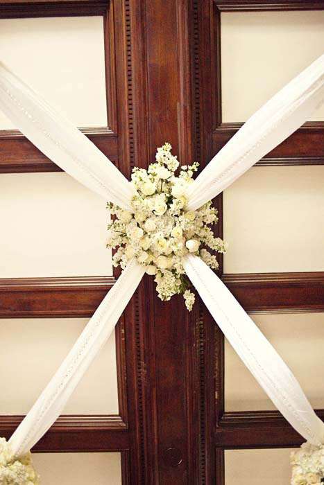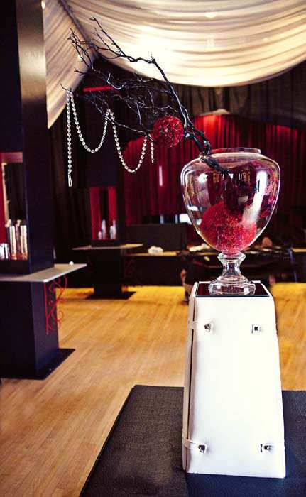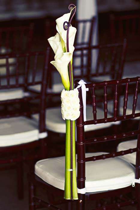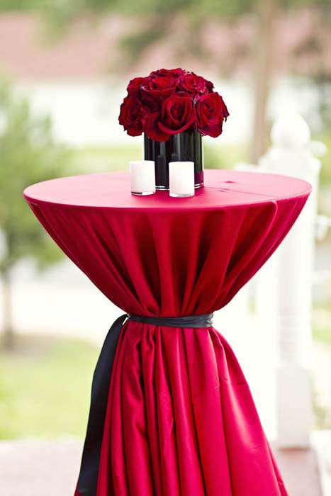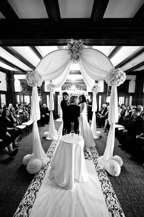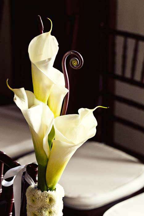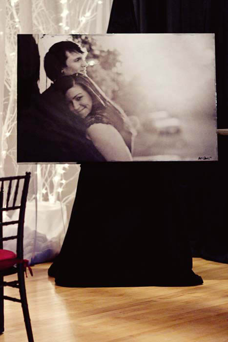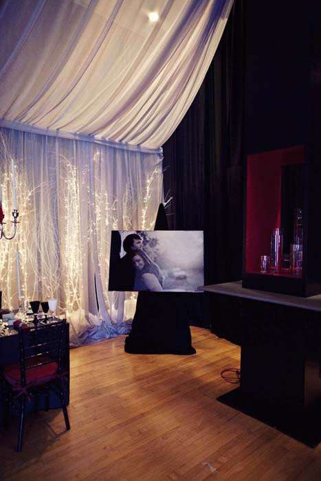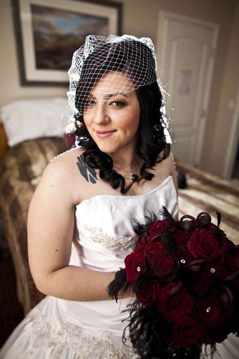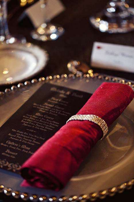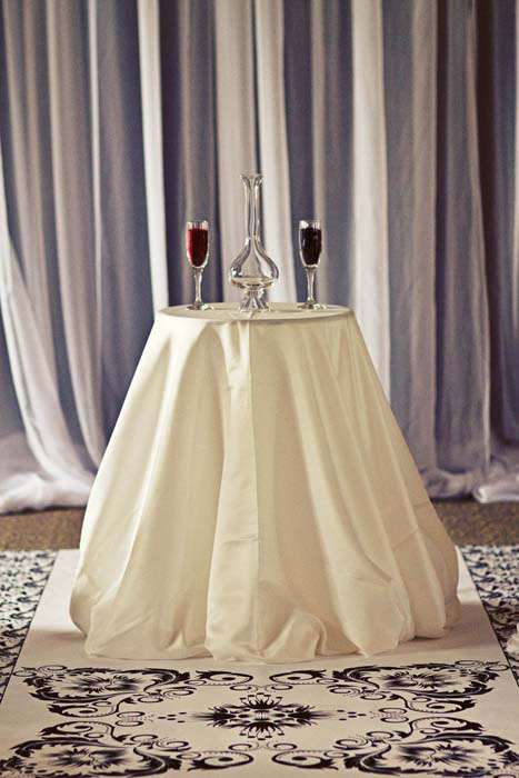And the certainly did that! For their theme, the groom started a collection of images that continued to grow at odd angles and tangents (tanks and military-begarbed women rendered in watercolor, fonts made from smoke, an art-deco staircase) while the bride mentally changed to a grand new thematic idea every week or two (classic/traditional, vintage Hollywood\film noir, gothic futurist). “We talked quite a bit about what of all our ideas had something in common, and which ideas had nothing in common with anything, ever. We came up with a small list of things we both would like to see, regardless of the direction our minds took us. We wanted lace, feathers, red roses, candle light and architectural elements. The end result was an elegant, simple but sophisticated ceremony that let us be at the center, visually as well as literally, followed by a reception that was like stepping into pure imagination. We couldn’t have asked for, or imagined, more.”