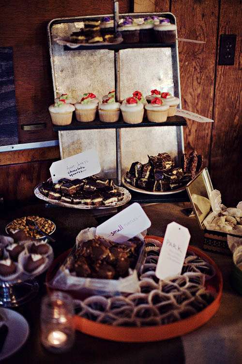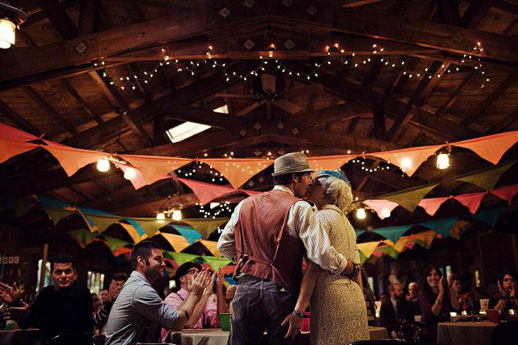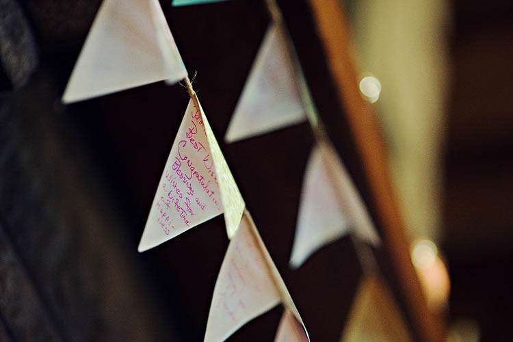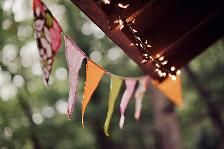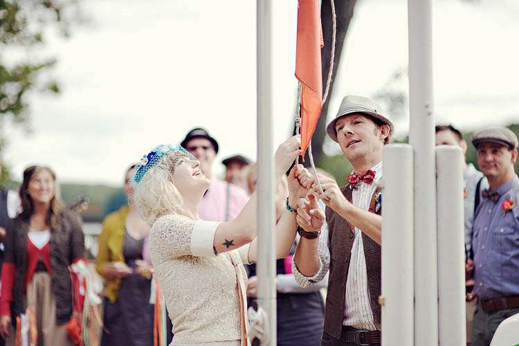 The entire wedding was an DIY and group effort, and the love and attention to detail really really shows (I am so in love with the car moustache!) Jamie’s Mum grew all the flowers, friends and family members made the deserts, they had a friend officiate and the whole wedding party got involved in the ceremony – and that’s just for starters! (make sure you check out the full list of everyone involed after the ‘jump’) “Following our ceremony we armed all our guests with ribbon sticks, pinwheels, and kazoos and had a parade to the flagpole where we raised a flag bearing our family crest,” they told me. “TSY rounded out the parade playing the Jason Mraz version of “One Love.”