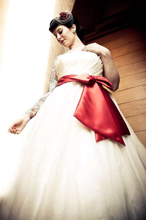 Jen wore a stunning Michelle Roth dress which she found in San Deigo. “We found this small boutique called “Here Comes the Bride”, and took one look at it and knew it’d be out of our price range, but we went in anyways (for fun). We explained the kind of dress I was looking for, and the lady helping me ran off and brought back the most amazing dress, I tried it on and fell in love with it right away, yes it spoke to me! It was twice my budget, but after not finding anything nearly as awesome, my Dad said that I should go for it, and I did. Luckily they could vacuum pack my dress, although it still took up half my luggage space on the way back to SA (so worth it!). I had the sash and bow changed to red satin, by a friend of my Christine of Smells Like Psycho. She also made my bridesmaid’s dresses.”