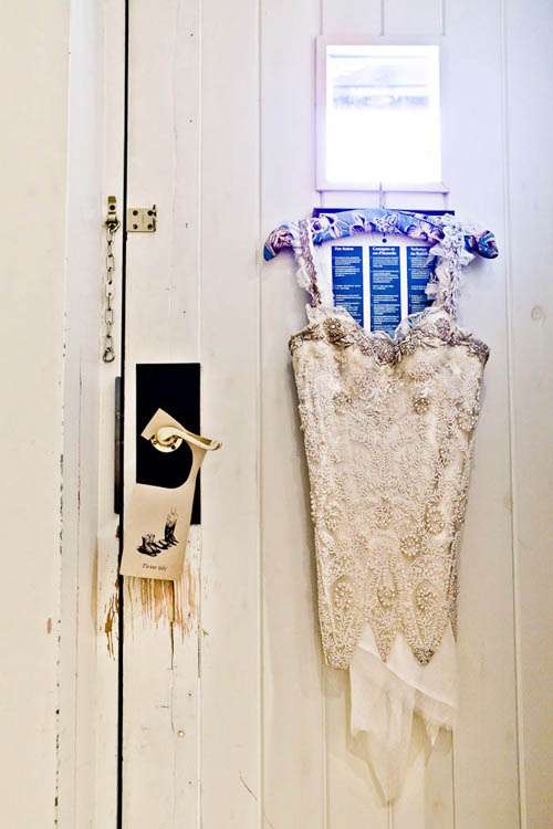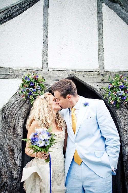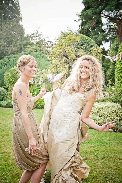 Oh I have yet another fabulous British wedding for you to le swoon over today. Joan & Tim’s English country garden theme was sure as hell given a Rock n Roll twist with the infusion of some seriously rad and personal touches. Not least of all, Joan’s incredible dress (actually a corset, skirt, bustle & train) from designer Jane Bourvis. It was all Vintage Couture. Jane was actually the designer behind Carrie Bradshaw’s famous ‘green seafoam ballerina dress’ that she wore in the final episode of Sex and the City (photo here) “Her shop is a wedding wonderland with vintage dresses and corsets dangling above you so you don’t know where to look at first,” Joan explained. “It was the first dress I tried on and within 5 minutes I knew that I wanted it.”