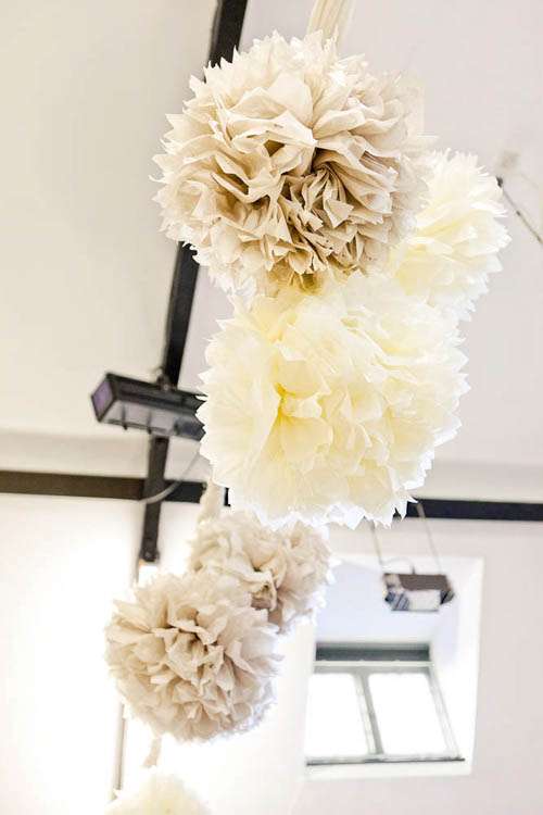The bride made all the decorations, invites, place cards, table names, pom poms (from a Martha Stewart tutorial), and the seating plan by herself. ” We transformed the village hall, which was very much a black canvas, into a really beautiful room using the cream & caramel colour scheme which we got from my dress. We also carted around lots of picture frames, candelarbras and engagement congratulation cards from home to dot around the hall and make it more homely and personal to us. ”