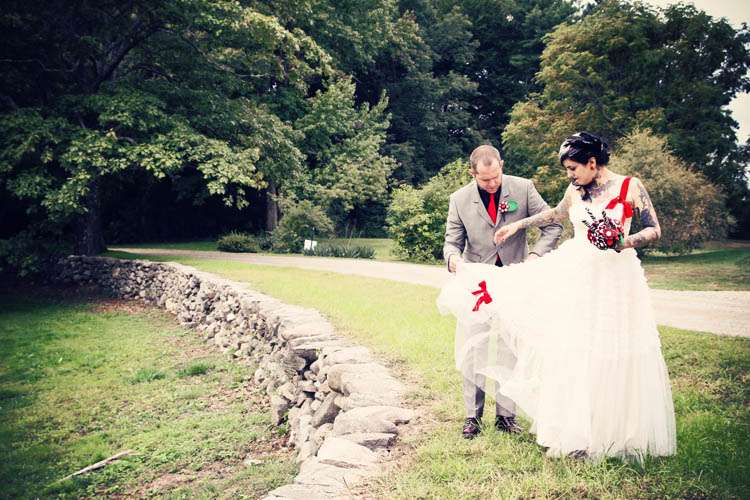 Patti wore an original 1950’s vintage dress, awesome shoes by Harajuku Lovers and feathers in hair. “I originally spent $2,000 on a custom made dress which I had designed myself,” the bride told me. “Well I had someone who specialized in wedding dresses make it (first problem) and I guess our vision was not the same and I didn’t like what she made at all! I went to Cambridge Antique market looking for some vintage brooches to jazz it up and the first thing I saw see when I turned the corner was this dress. I think it had a light shining on it with my name! It was meant to be and just a week before the wedding and it fit like a glove! Oh and the best part? It only cost me $150!”
