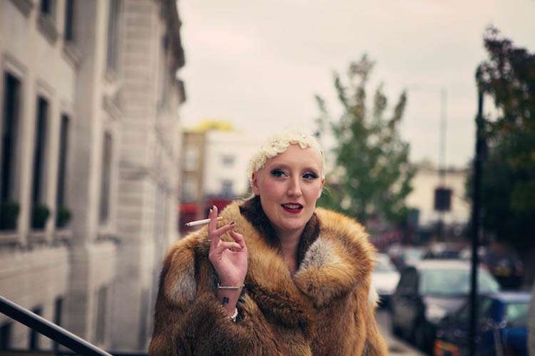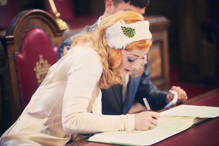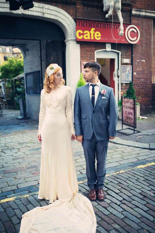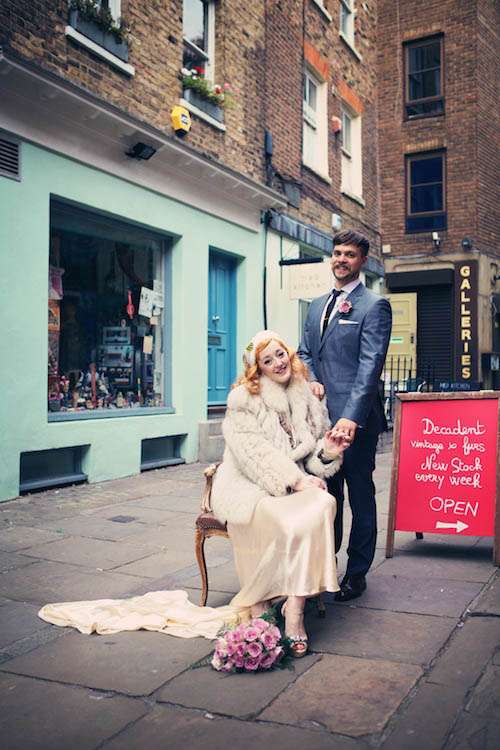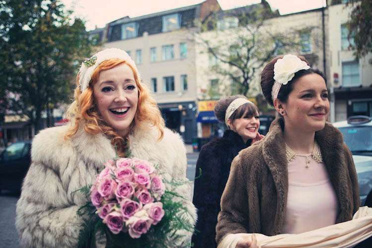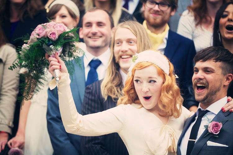 Sophie looked every bit the Rock n Roll princess in a genuine vintage dress which she bought from My Sugarland in North London. “It was the first and only dress I tried on,” said Sophie “and its beyond special having been a museum piece and nearly 100 years old! It was covered in mould and little rips, I owe Zoe at My Sugarland a massive thank you because she helped my Dad see beyond the grubbiness of it and talked him into buying it for me! She also passed me on to the wonderfully stern but kind Jacqueline Byrne who used to be a seamstress for the Queen no less (!) who tidied the dress up perfectly, even recovering all the buttons on the sleeves.” With her perfect dress, Sophie wore a custom made headdress from Lilly Lewis which she customized with a brooch belonging to her Mother. She also also wore her Mother’s silver fox fur jacket which was a gift from her Dad on the day she was born!