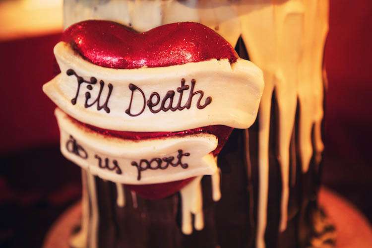 The couple saved money by decorating the venue themselves. The collected 115 old penguin books from charity shops and Sophie’s Mum covered them. A lot of work but totally worth the effort – they look fantastic dotted around the venue don’t they? Before the wedding both Barney & Sophie went down to a local market and bought pumpkins and pomegranates to decorate the venue with. Everyone they know had also been collecting glass jars for the humbugs that we covered with black lace and put on the table. They also screen-printed the cameos to put on the back of the chairs. Originally Sophie had planned to not have any flowers at all, but at the last minute she feel in love with some “mouldy looking bruised roses” and her Mum bought them for her and made them into her bouquet. The finishing touch to the decor really is the incredible ‘Til Death Do Us Part’ cake by Brighton based Choccywoccydodah. Magnifique!