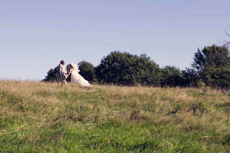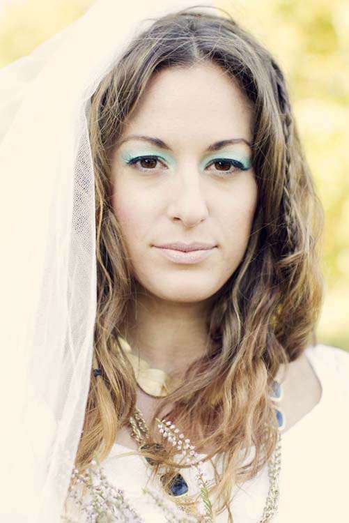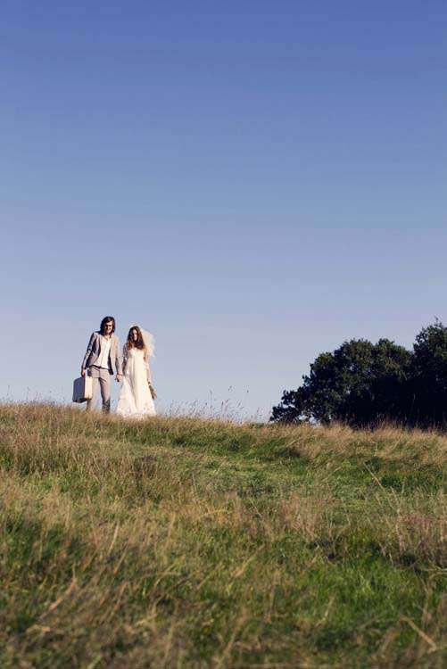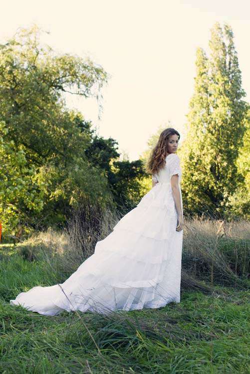 This 1970’s Woodstock inspired shoot took place on Hampstead Heath, London. The shoot was set up by wedding planner & stylist, Mary Herrington of Forever & Ever Events. She and photographer Caro Hutchings wanted to create a shoot to show how you can easily create a beautiful look with vintage and reclaimed items that won’t break the bank. “Finding inspiration in the ‘70s doesn’t mean that you have to stick with the original dress form the ‘70s or be literal about it; rather, you can take a vintage dress or theme and modernize it,” Mary told me. “For example, the most amazing part of the dress was the tiered back – we took away the billowy elbows and the high neck, which really allowed you to highlight the back of the dress as the focal point.”