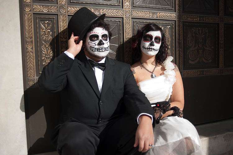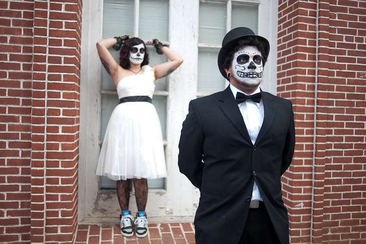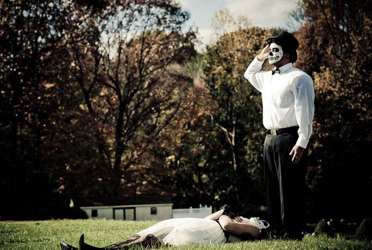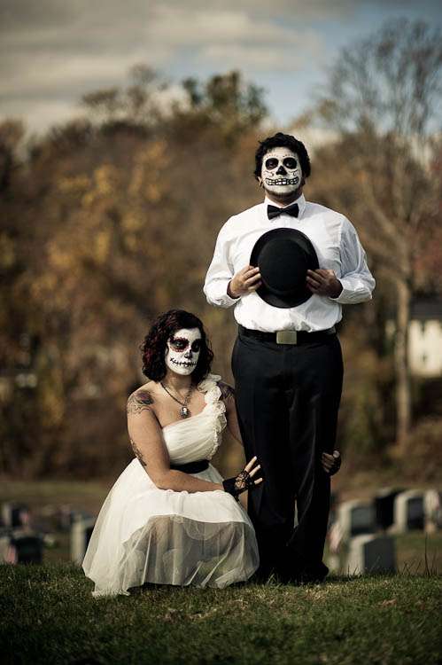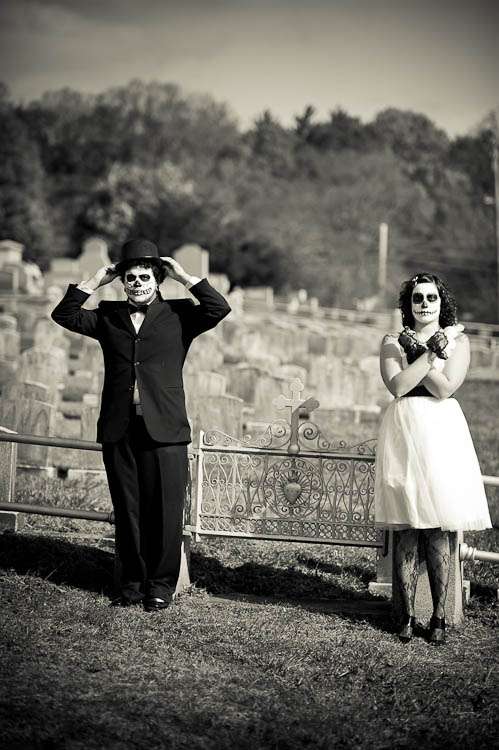 Adam & Barbara’s trash the dress shoot is like nothing I’ve ever seen! Day of the Dead make up fused with an awesome cemetery location made for something pretty special. The bride did the make up “It was a trial and error process,” she explained. “I looked up make up designs online and tried different ones to see which would look best with my (and my husband’s) facial structure, without looking too cluttered. Since it was right before Halloween, I could find cream makeup almost anywhere, and picked up a few tubes, and some extra just in case I ran out. I applied it with paint brushes, which helped so I could layer it on without it looking too thick. I had to apply three layers of white to give it a true white appearance, and if I hadn’t run out of time, I would’ve applied more.”