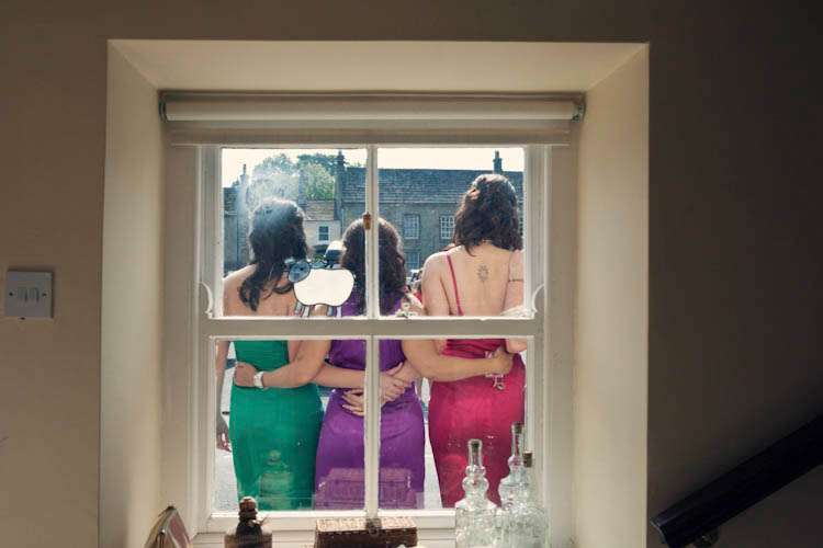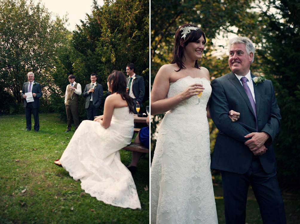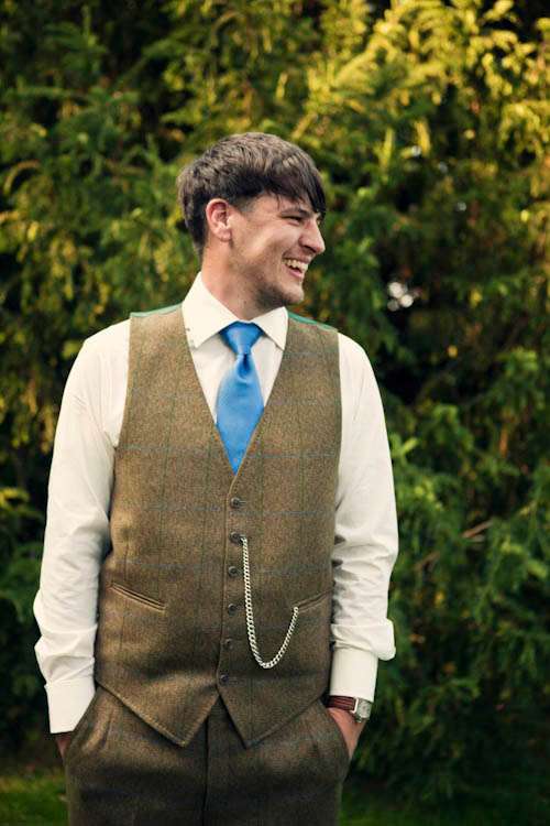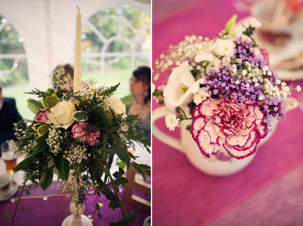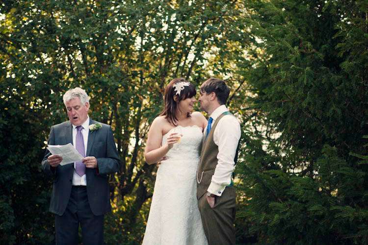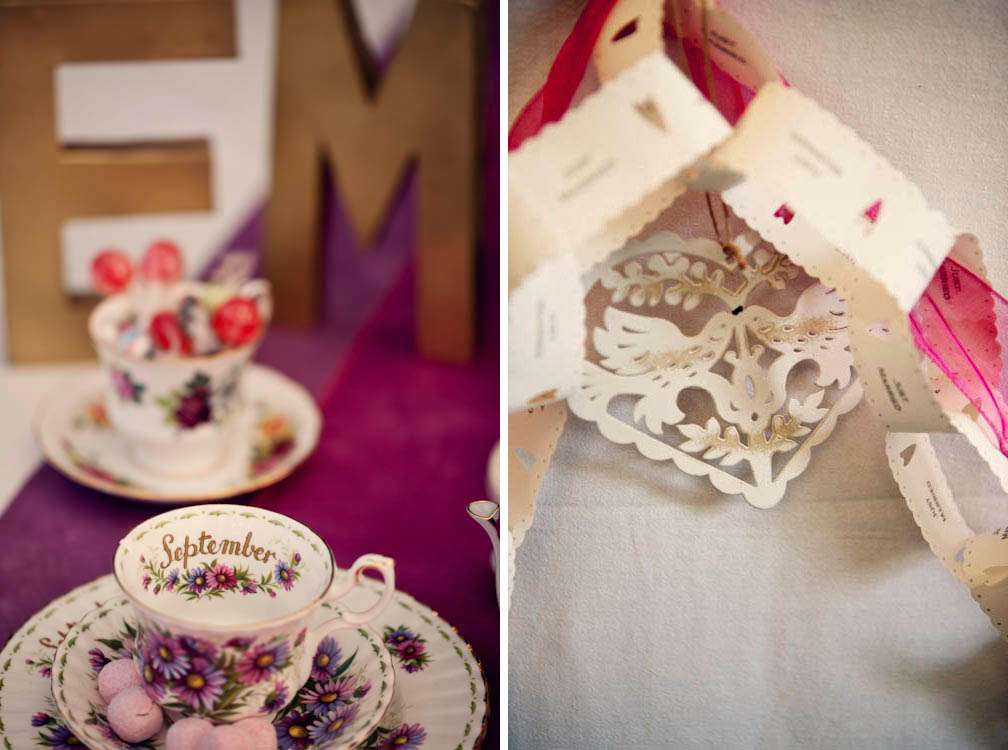 The cupcakes were made by the Mother of the bride, the flowers were all arranged by the Mother of the groom and the bridesmaids were all asked to find and style their own outfits, making the whole day a really group effort. The marquee decor was created by the bride, the Mother of the bride, the maid of honour and the Mother of the groom. “We spend the year leading up to the wedding going in every charity shop we knew, to source tons of broken and mismatched tea sets. These were filled with candles and sweeties and joined on the tables by birdcages and various other bits of kitsch.  As it got dark, the roof was lit up like a night sky and the trees outside were twinkling with fairy lights” Emma reminisced.