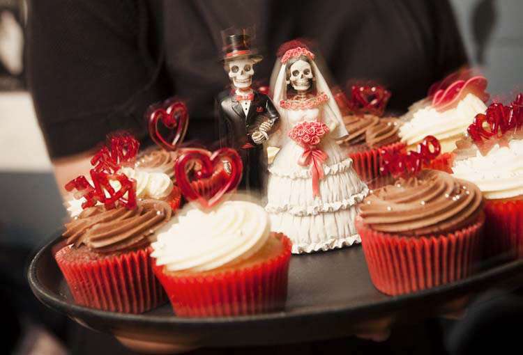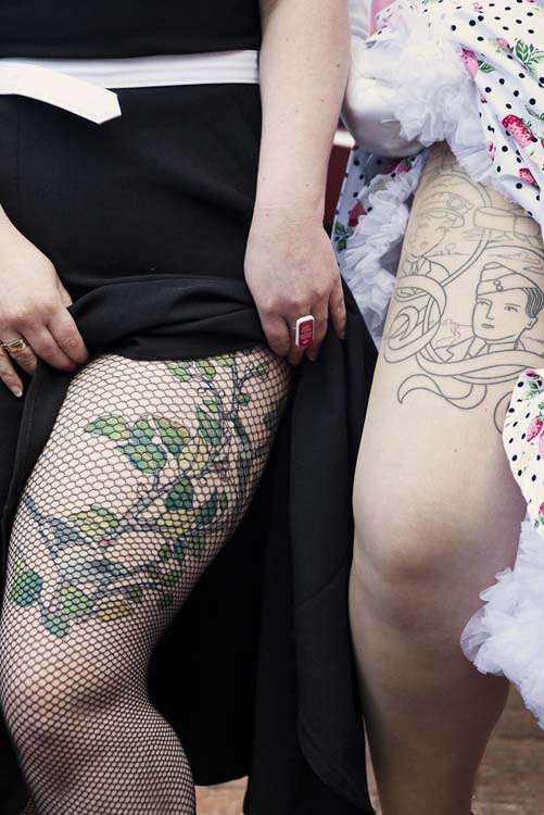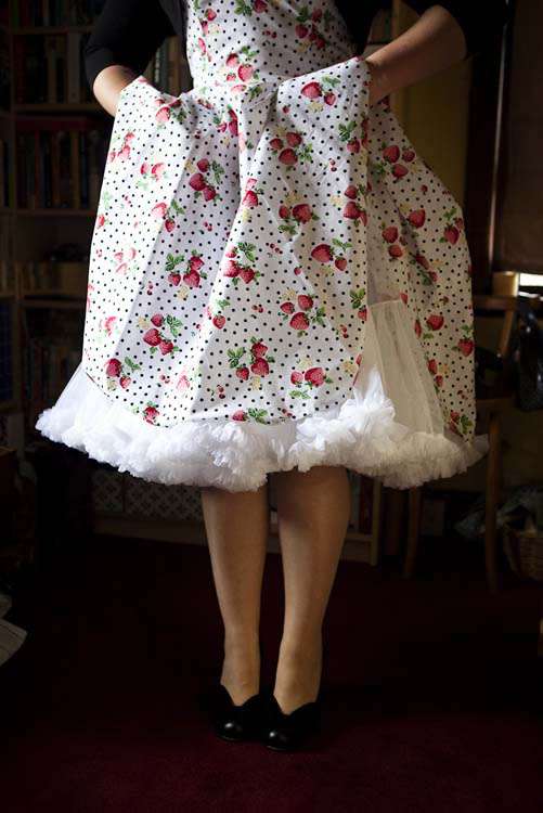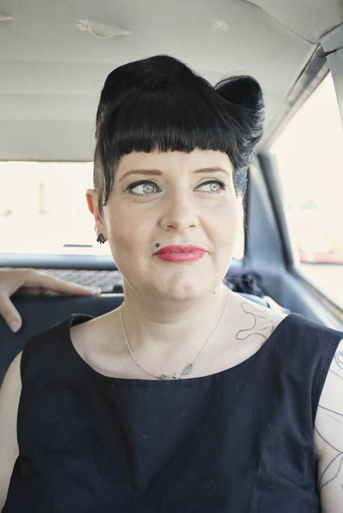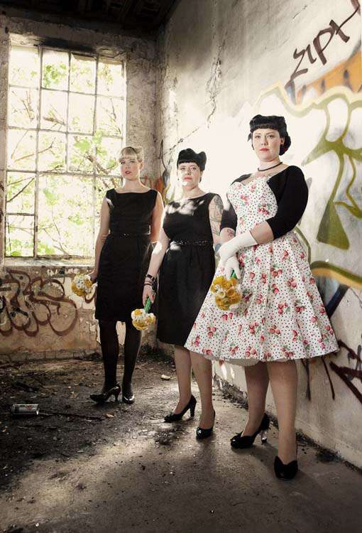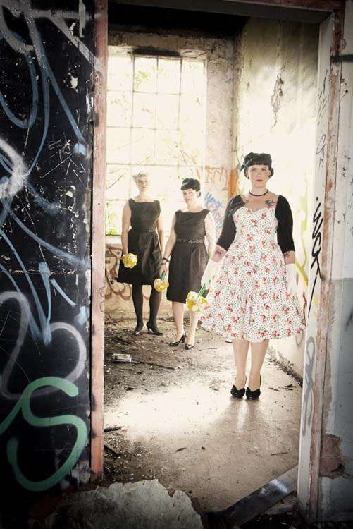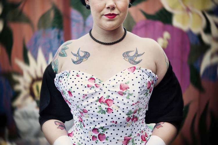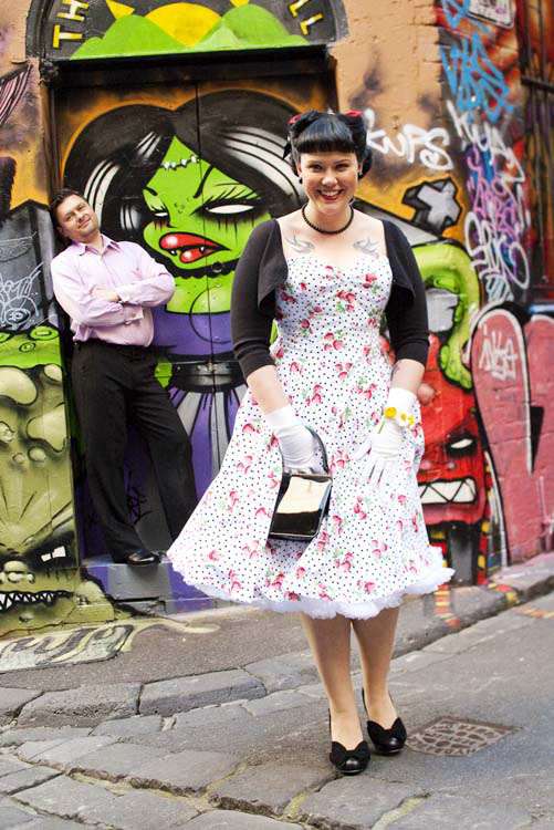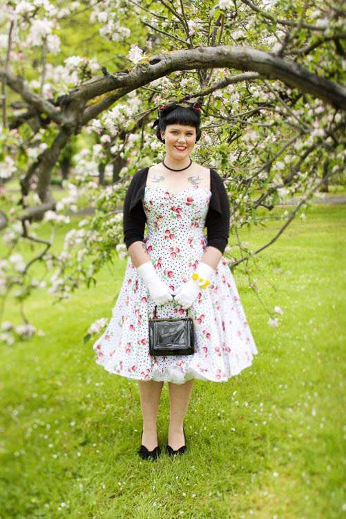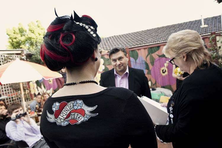 “I wanted to look like me on my wedding day, not like something that had been churned out of the ‘bridal industrial complex’. My dress was white but printed with black polka dots and strawberries which I bought from Vivien of Holloway when I visited my sister in London. I found my vintage white gloves on eBay. I fell in love with my shoes when I saw them on line and bought them to wear to work as an alternative to basic black but I ended up wearing them to the ceremony as well. My beloved hairdresser of two years, Kat, created spectacular, vintage inspired hairstyles for me and my two attendants. One of my best friends did our make up.”