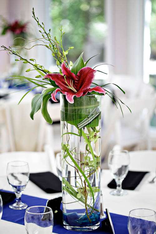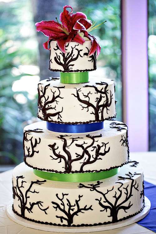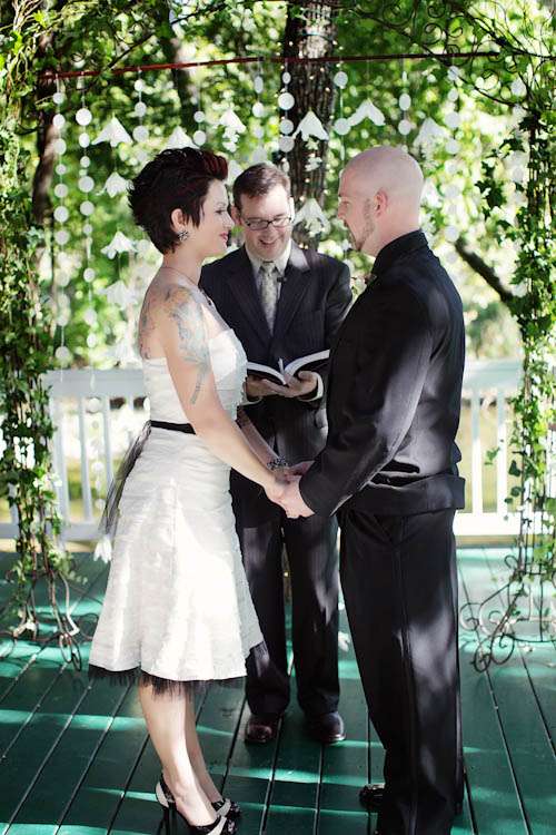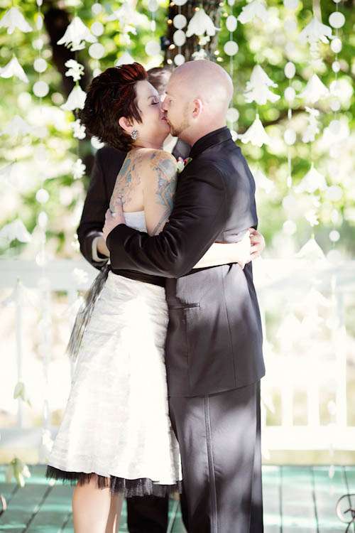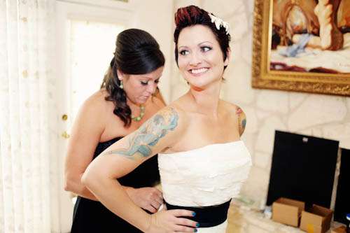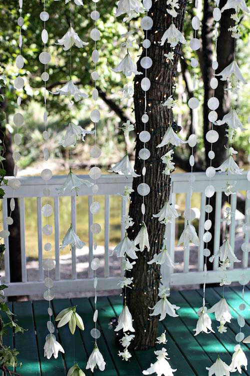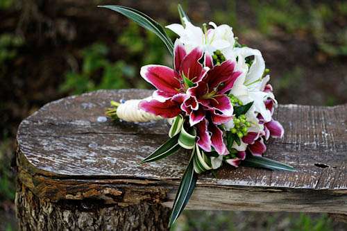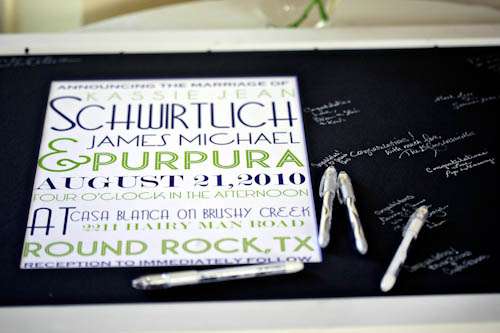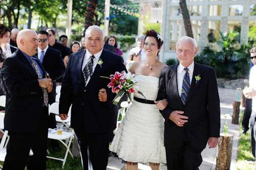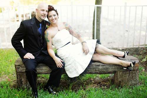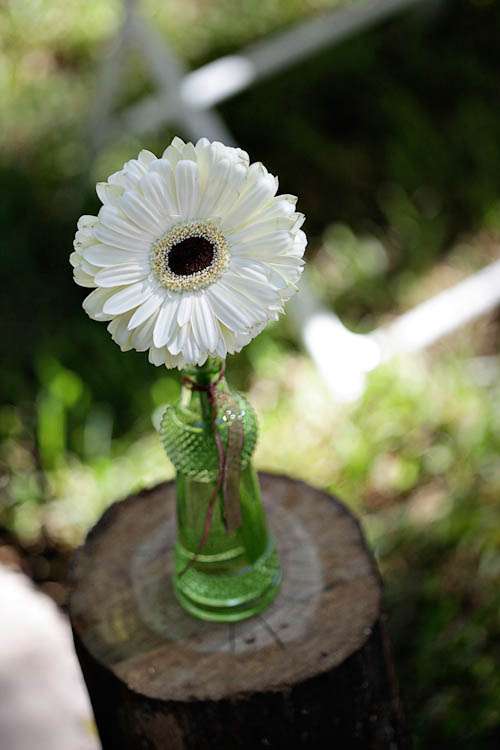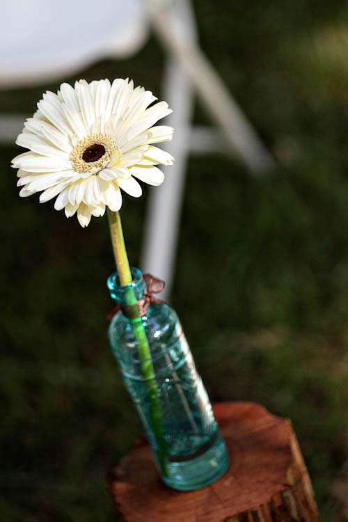 James & Kassie got married at Casa Blanca on Brushy Creek, Texas in an “earthy-vintage” themed wedding. The couple chose their venue because they felt it completely reflected the vibe they wanted for their day. “The outside ceremony site, decks for guests to hang out, trees everywhere…..it was just perfect,” began the bride. ” The venue allowed for simple accents and decorations, which was just what I wanted. The colors were bright and happy, however allowed for that earthy theme to mix right in. Down our aisle I had 1 ½ – 2ft tree trunks set along each side, with simple vintage bottles and daisy’s just to add the earthy-vintage flare. Our archway was designed with lilies and shells, with vines and curly willow, which added that perfect backdrop for our quick ceremony.”