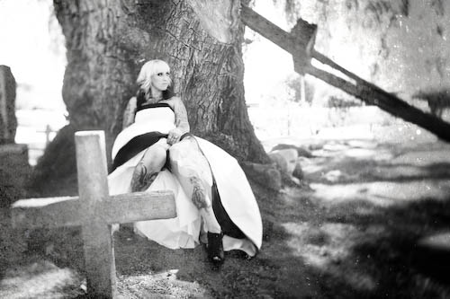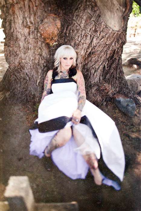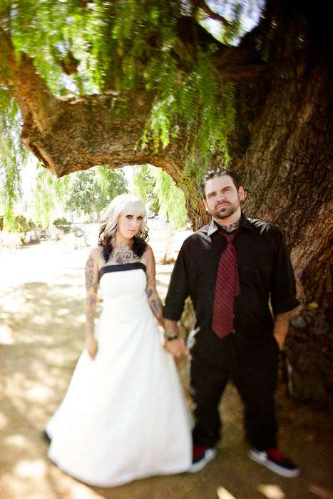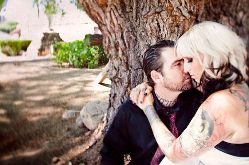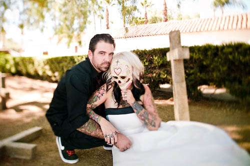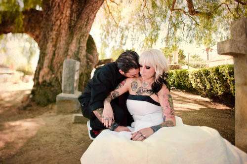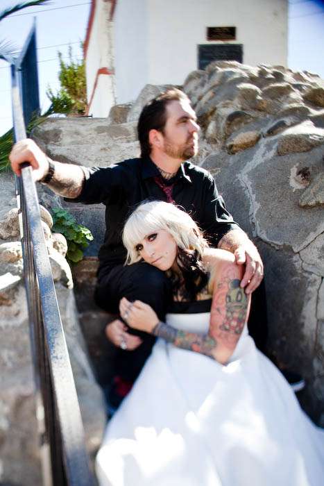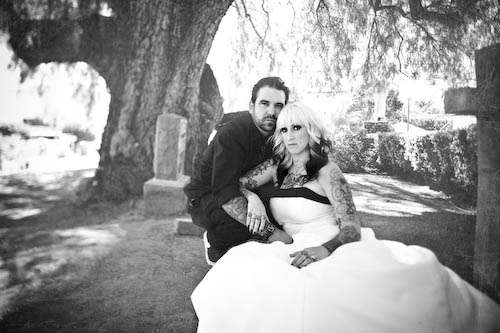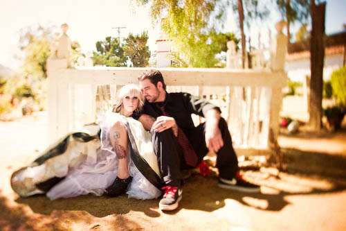 Jesikuh just wanted some amazing pictures of her and husband that really told a story about them as well as showcasing their edgy style. After discussing locations, the team decided that the Pala de Luz Mission in Pala, CA would be cool as their was an old cemetery there. Both Jesikuh & Chris are big fans of the”Day of the Dead” styling so they brought a mask they had made themselves to pose with. The shoot concluded with Chris graffiting the dress!