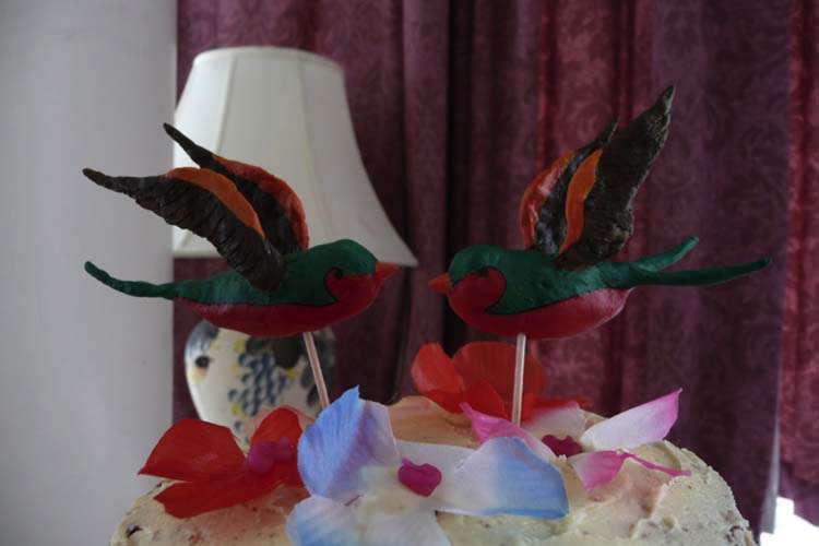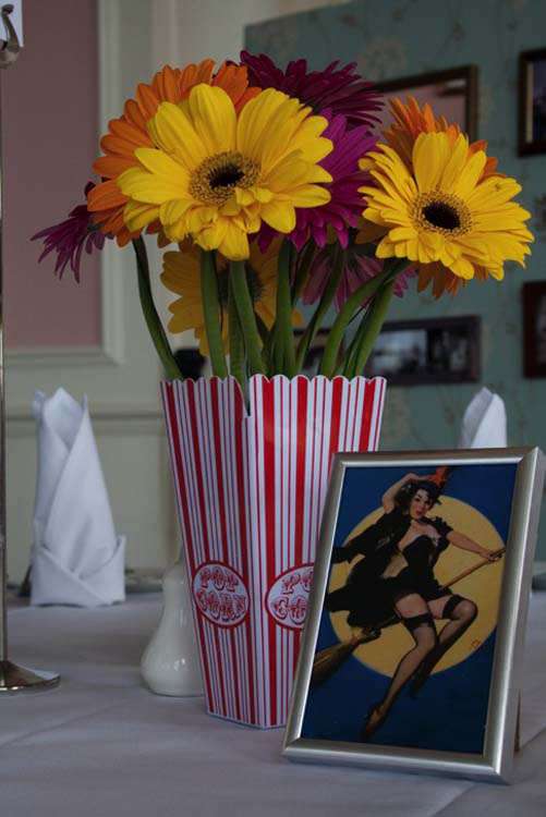 DIY played a big role in this wedding, from the cake (made by Jessica’s Mum) to the decor. The bride’s sister made the fabulous bird cake topper and her husband made the awesome ‘picture frame wall’ photo booth, complete with extra picture frames filled with photoshopped retro photographs of the couple! Jessica also designed and made all the invites and stationary. As a final, super personal, touch, every table had a pin up picture by Gil Elvgren and a family wedding photo from the 50’s from guests families.