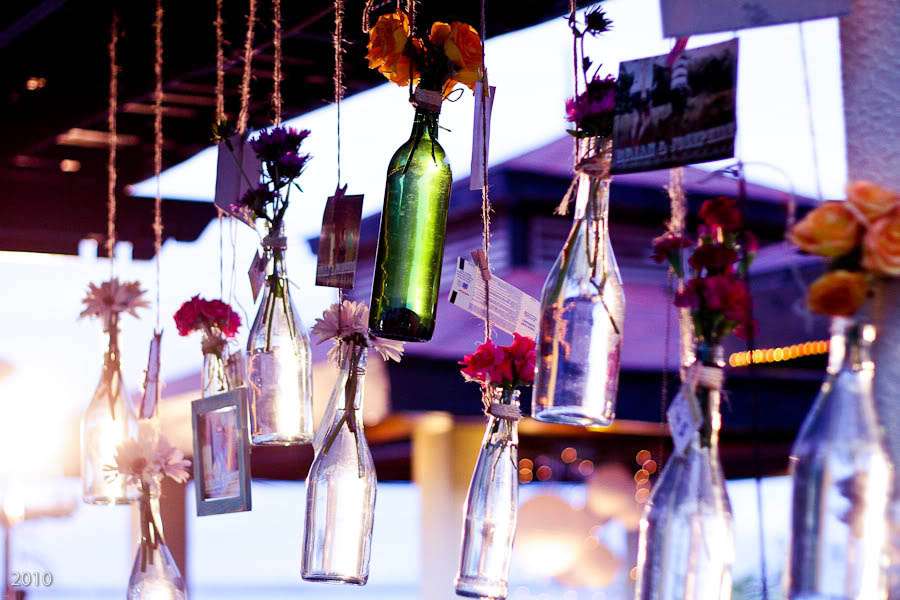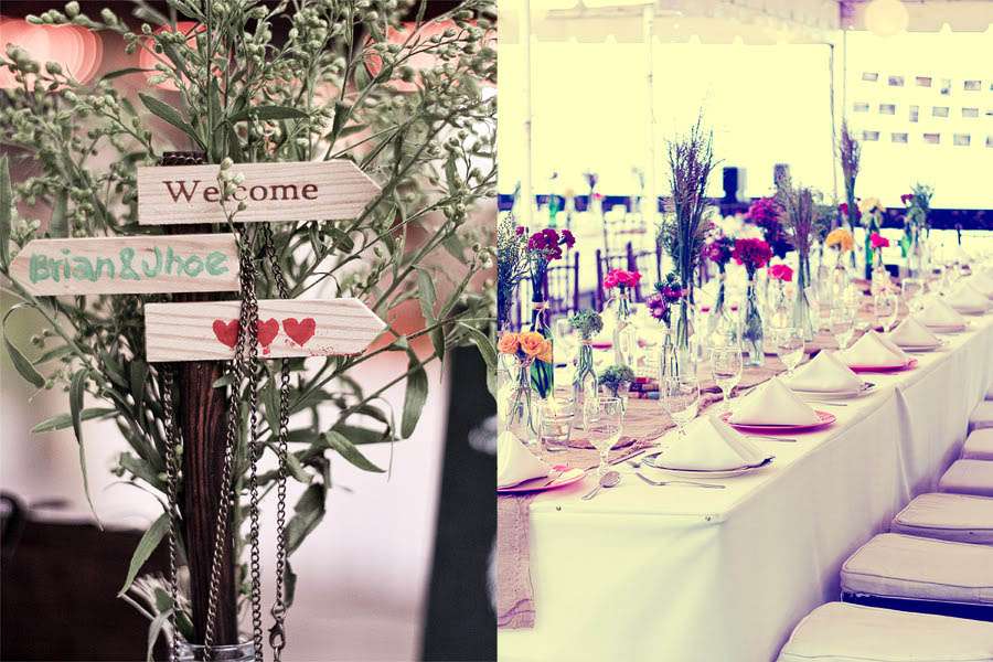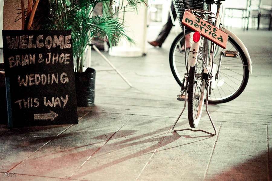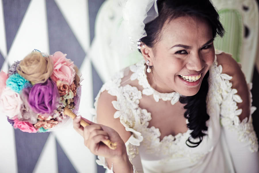 The couple got married at Vistamar Boardwalk in Mactan Cebu City, right on the beach in a DIY heavy, eclectic vintage style wedding. Josephine in particular worked really hard to create something beautiful and unique for their nuptials. First up, Josephine crafted her own unusual bouquet from vintage necklaces with fabric flowers on them and a recycled egg beater (!) as the ‘stem’. She even used the left over beads and things from the necklaces in the centrepieces! She found this awesome bike pendant which she disassembled to craft Radney’s boutonniere. In keeping with the bicycle theme, the couple chose to ride to their reception on a bike instead of getting in a car – which they decorated themselves.
