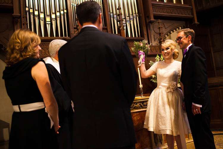 The bride wore an adorable dress by Dolly Couture, Christian Louboutin shoes and a vintage purse and gloves which she’d found on their holiday in London.