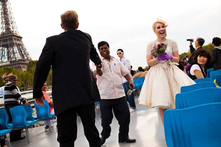 After the wedding, the couple took a tourist boat ride along the River Seine for photos and to see Paris from the river. “Being full of tourists, we kind of stood out like sore thumbs”, Nicholas continued, “but, the tourists loved it and proceeded to pose with us for a good 10 minutes of the boat ride. It was kind of a fun little rock star moment on tour boat in Paris.”