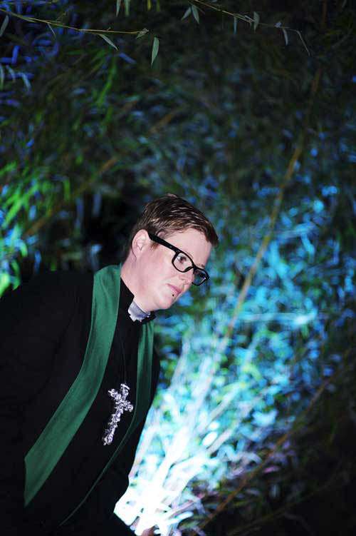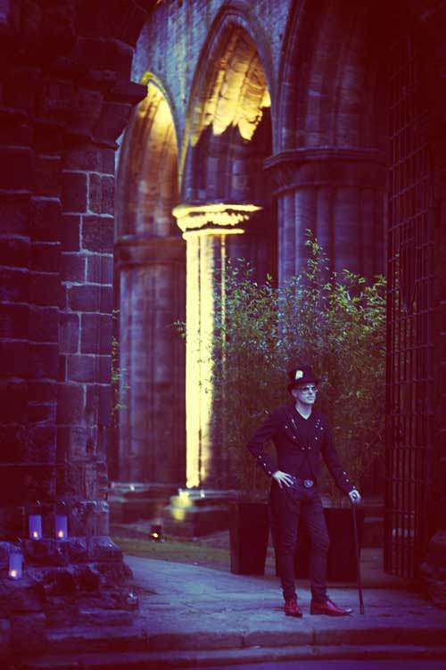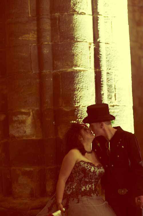 “The UK wedding was totally unofficial, not even a civil ceremony. It was for our friends and family to see us “married” in our ideal perfect way. So, we took a stroll around Kirkstall Abbey last year and joked about how cool it would be to get married there…and then it started! We got prices from the Abbey (ludicrously cheap to hire) and the whole thing grew arms and legs all by itself! The lights, fog, music, shrubbery…we had an insanely theatrical wedding with a rock music soundtrack to boot.”