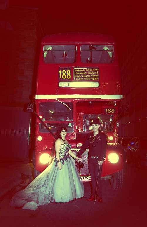 “We had about 45 guests for the whole thing, everyone said it was the coolest wedding they’d ever been to and had never seen anything quite like it! We all hopped on an old red route-master double decker bus to take us to the reception where we got royally pissed and danced like idiots all night. No cheesy tunes were played and we rocked out to NOFX, Me First and the Gimme Gimmes, The Jam, Queen, ACDC, Green Day (and a bit of Bon Jovi for the laydees! Much to Dale’s displeasure!) It was freaking awesome!!”