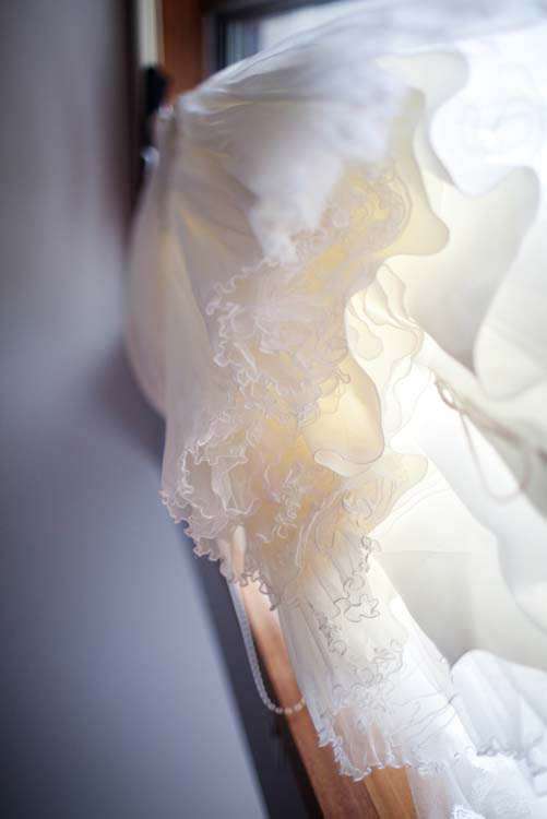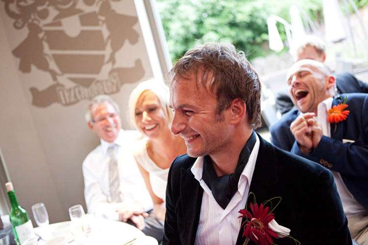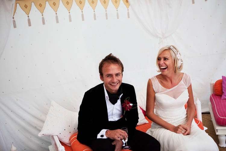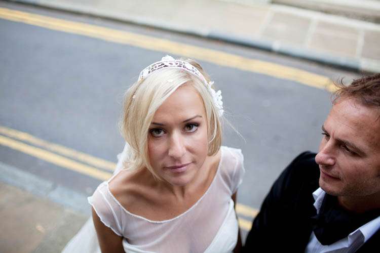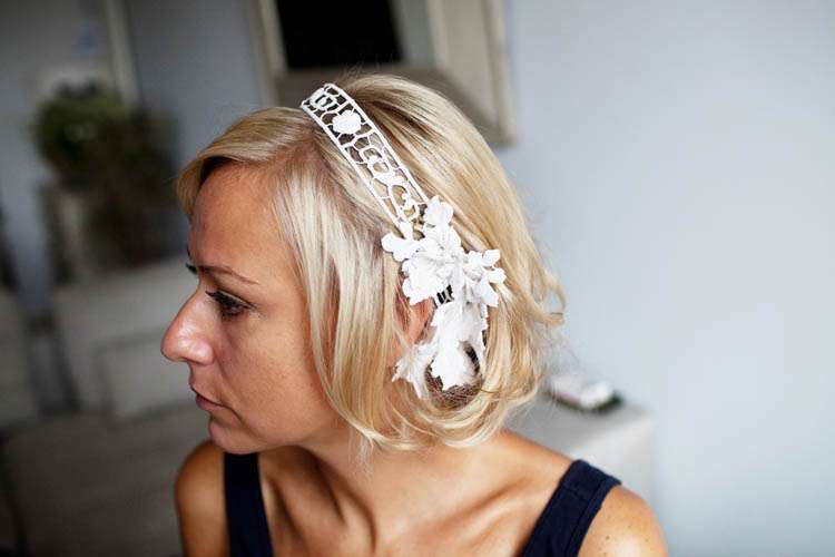 Sarah had her dress, veil and acessories made by local dressmaker Jacqueline Byrne. “She makes beautiful vintage styled dresses and wedding accessories,” exlained Sarah. “After trying on a few off the peg disasters (quite hard because I am just over 6ft tall) it was a no brainer to with her. Basically she got to know me and my sisters and Mum and found out about the wedding and gradually designed a dress together that evolved as it was made, that was so fun and she really knows what she is doing but at the same time the dress can be really personalised too. We were still working on right up u to, 2 days before. She also made my vintage veil and 20s hair band, she even beaded my cardigan which is didn’t need because it was such a balmy hot day hot the end. She also makes dresses for the princess Ann and she a real pleasure to work with!”