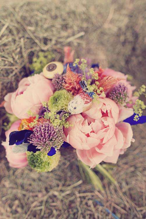 “Our colors were very vibrant and based off of a beautiful bow necklace found at Anthropologie. We also used bow ties as a major theme in the shoot…as you can tell our cake had hand-made bow-ties tapering down! To complete the look, we found some amazing bow tie rings at a flea market. We were even able to scrounge up a moustache ring! Our bouquet was filled with all kinds of amazingness of color and pretty including some doorknobs and birds. Finally, we managed to find a chandelier with ice cream cones! They were perfect because they matched our color palette to the tee.”
